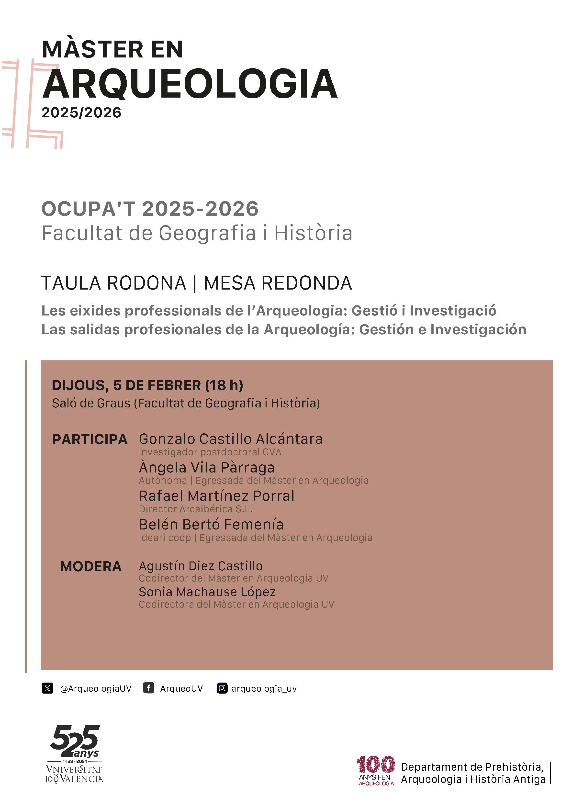 Dins de la jornada OCUPA’T – Jornada d’Empleabilitat, els nous Grau en Arqueologia i el Doble Grau en Arqueologia i Història, així com el Màster en Arqueologia de la Universitat de València organitzen dues taules redones amb professionals del sector, amb l’objectiu d’apropar a l’estudiantat les diferents eixides professionals de l’arqueologia i facilitar el contacte directe amb el món laboral i investigador.
