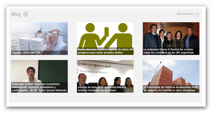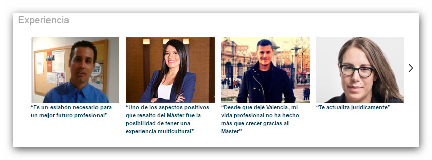 En la capçalera de la nova web una sèrie d'imatges canvien automàticament per a destacar els aspectes més importants que defineixen al Màster en Dret, Empresa i Justícia de la UV, i que són: