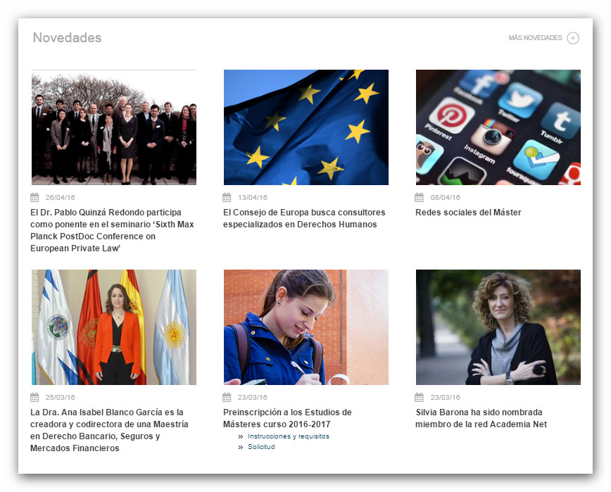 L'apartat “Novetats” solament ha canviat en el seu disseny però continua sent l'agenda de la Facultat de Dret, on l'estudiant pot trobar tots els esdeveniments que es realitzen relacionats amb el Màster.