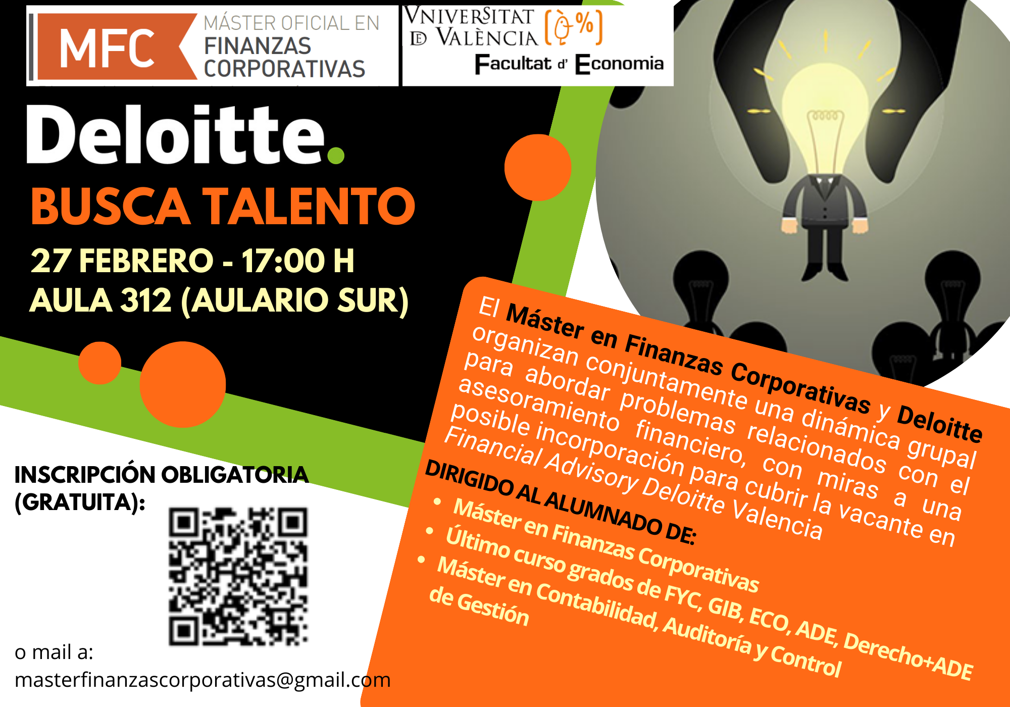 El próximo 27 de febrero de 2025 a las 17:00h en el aula 312 (Aulario Sur), el Máster en Finanzas Corporativas y Deloitte llevarán a cabo una dinámica grupal en la Universitat de València