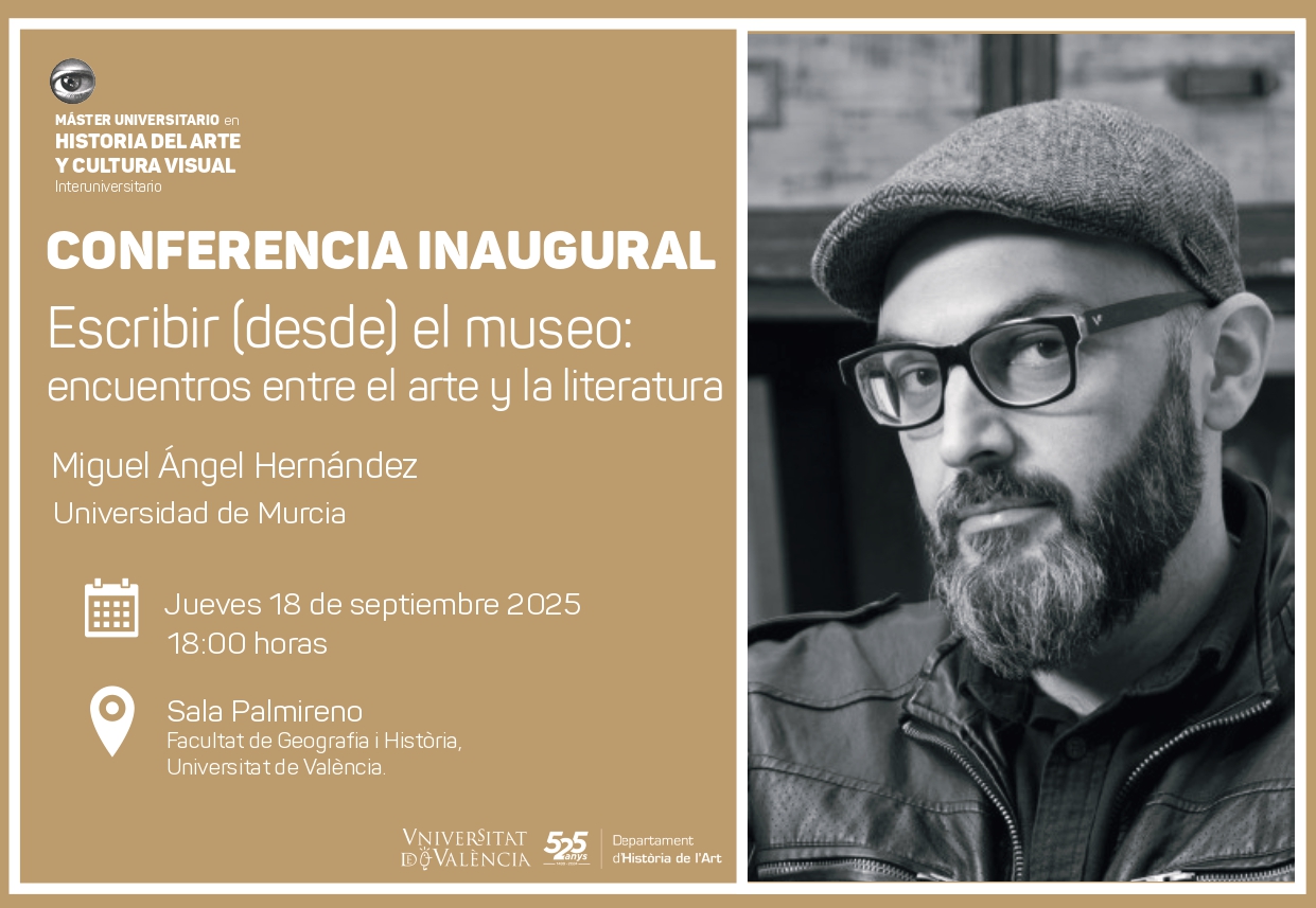 El Màster Universitari en Història de l’Art i Cultura Visual obrirà oficialment el curs acadèmic 2025-26 amb la conferència inaugural “Escribir (desde) el museo: encuentros entre el arte y la literatura”, a càrrec de Miguel Ángel Hernández, professor de la Universitat de Múrcia i reconegut especialista en teoria de l’art contemporani.