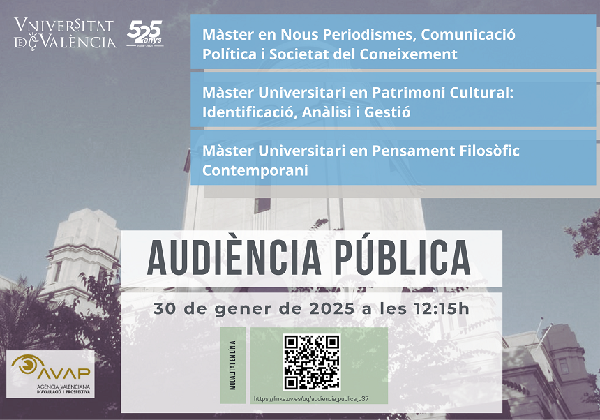 Audiència publica el dia 30 de gener del Màster Universitàri en Patrimoni Cultural: Identificació, Anàlisi i Gestió Audiència publica el dia 30 de gener del Màster Universitàri en Patrimoni Cultural: Identificació, Anàlisi i Gestió 20/01/25 [Llegir més]