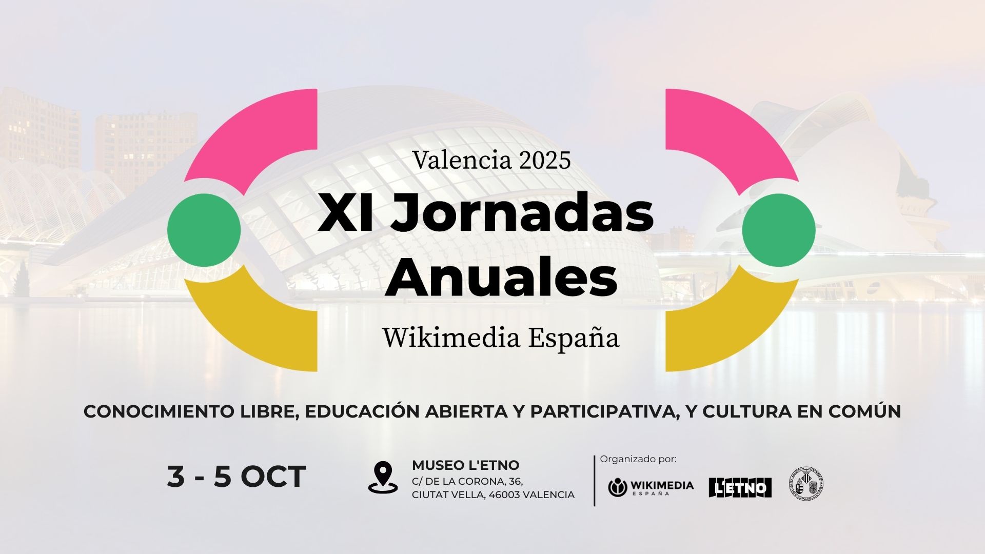Del 3 al 5 d'octubre de 2025, s'han celebrat a la ciutat de València les XI Jornades Anuals de Wikimedia España 2025, una trobada que va reunir més de 70 persones compromeses amb el coneixement lliure sota el lema: “Coneixement lliure, educació oberta i participativa, i cultura en comú”.