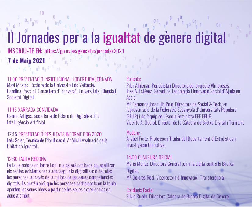 La Càtedra de Bretxa Digital de Gènere, signada entre la Generalitat Valenciana i la Universitat de València, organitza el pròxim 7 de maig les II Jornades per a la Igualtat de Gènere Digital.