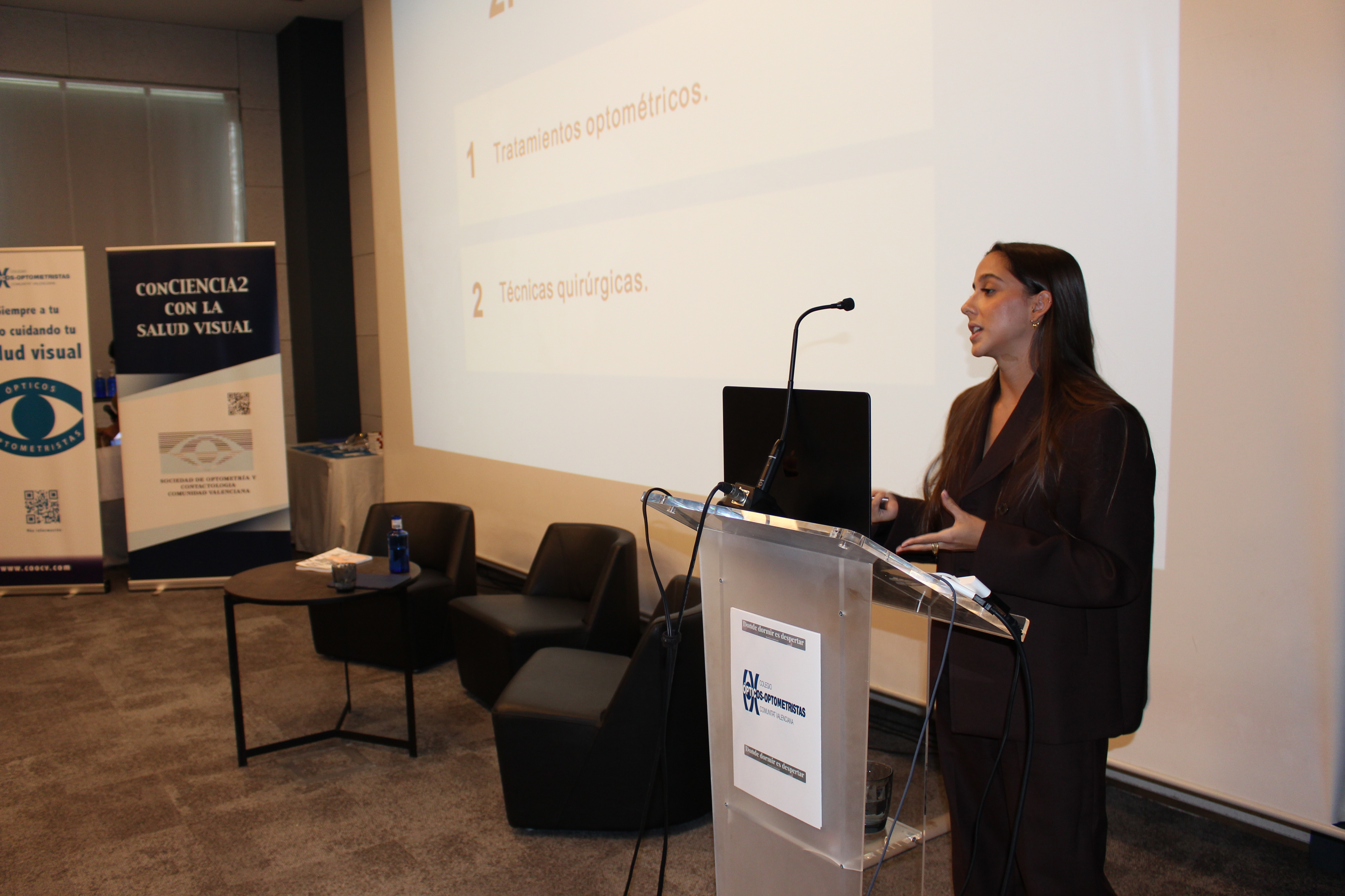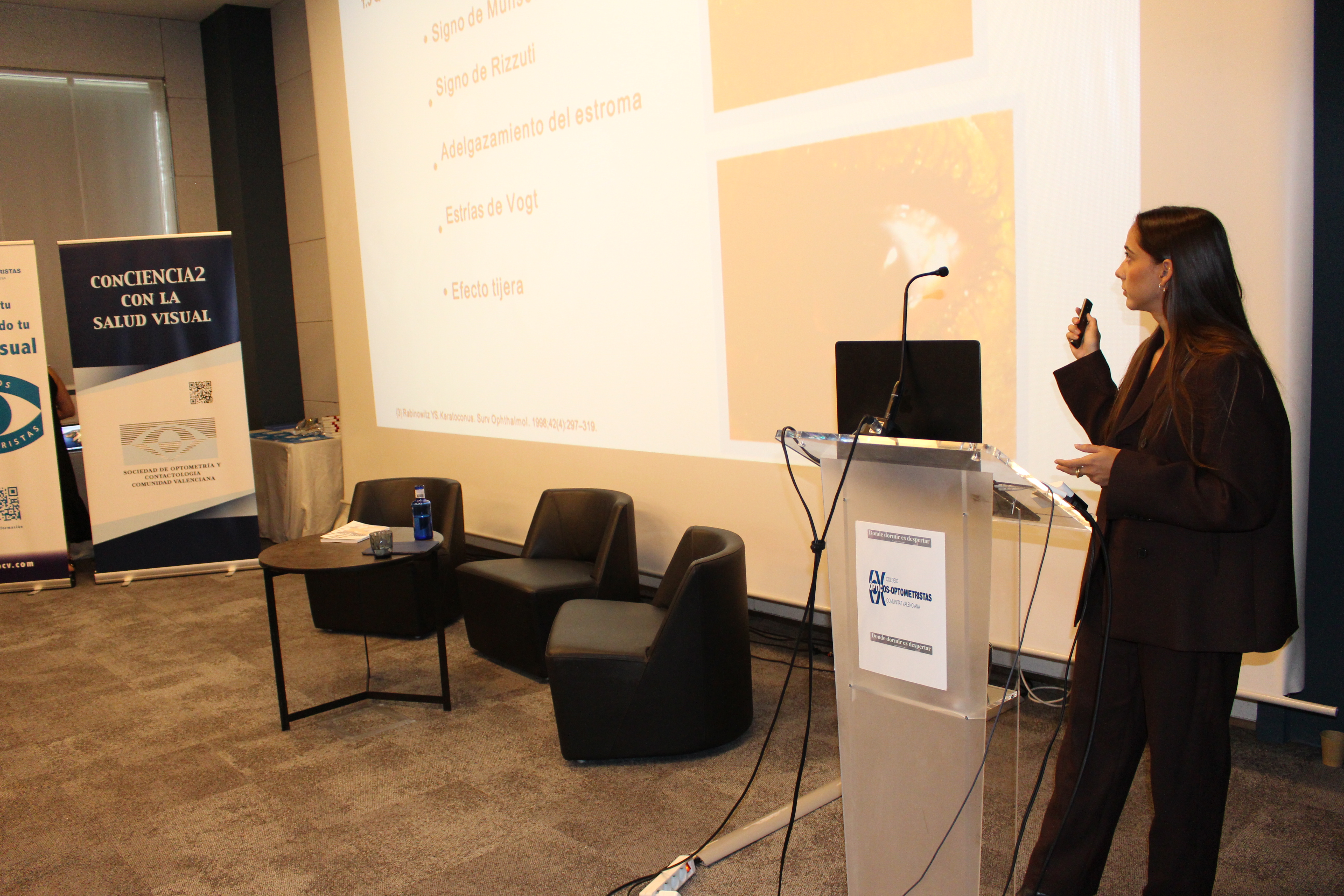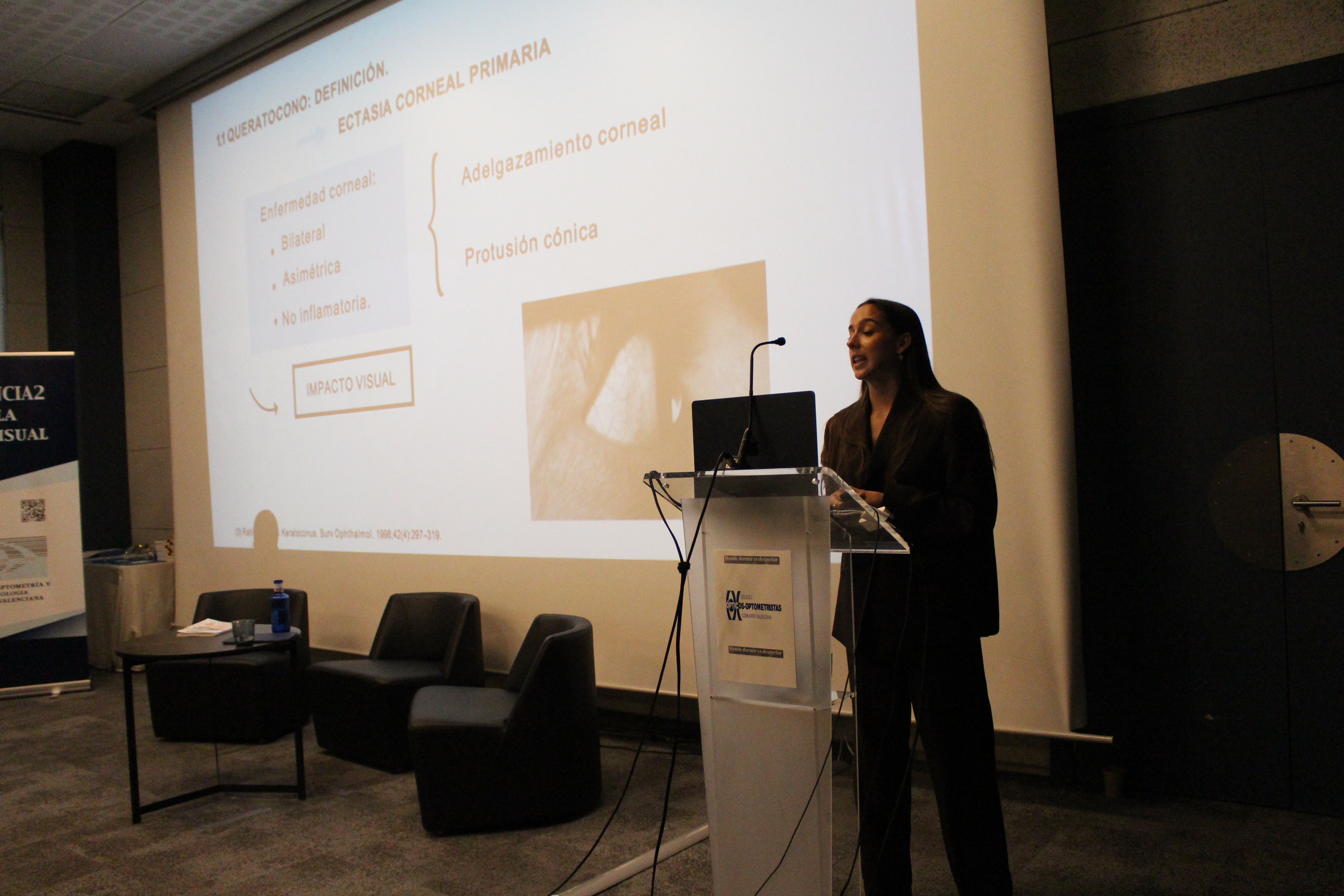 El treball Fi de Grau de Violeta va versar sobre una revisió bibliogràfica dels tractaments optomètrics per al queratocon, i va ser dirigit pel professor César Antonio Albarrán Diego. Violeta va explicar als presents que l'objectiu