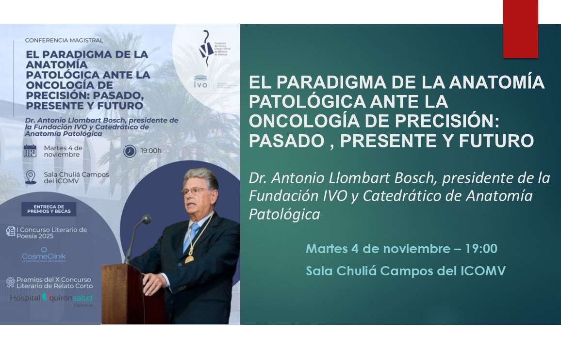EL PARADIGMA DE LA ANATOMÍA PATOLÓGICA ANTE LA ONCOLOGÍA DE PRECISIÓN: PASADO , PRESENTE Y FUTURO Por Dr. Antonio Llombart Bosch, presidente de la Fundación IVO y Catedrático de Anatomía Patológica Martes 4 de noviembre – 19:00 Sala Chuliá Campos del ICOMV