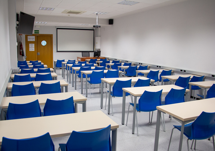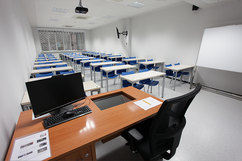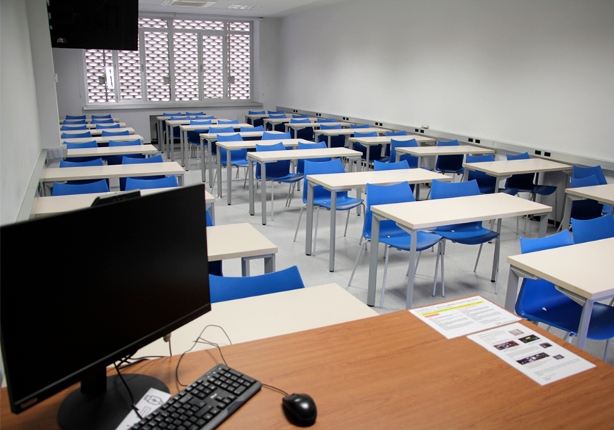 This classroom has 54 seats. Mobile and adapted furniture. Computer equipment for teaching staff with multimedia desktop that includes microphone and independent audiovisual system. Hybrid teaching system with built-in monitor camera included. Video projector with pointer/slider for presentations and 55" monitor to enhance projection. Darkening for projection by means of blinds. Whiteboard. Sockets at workstations. Phone support with concierge staff. Security PA system. Wi-Fi.