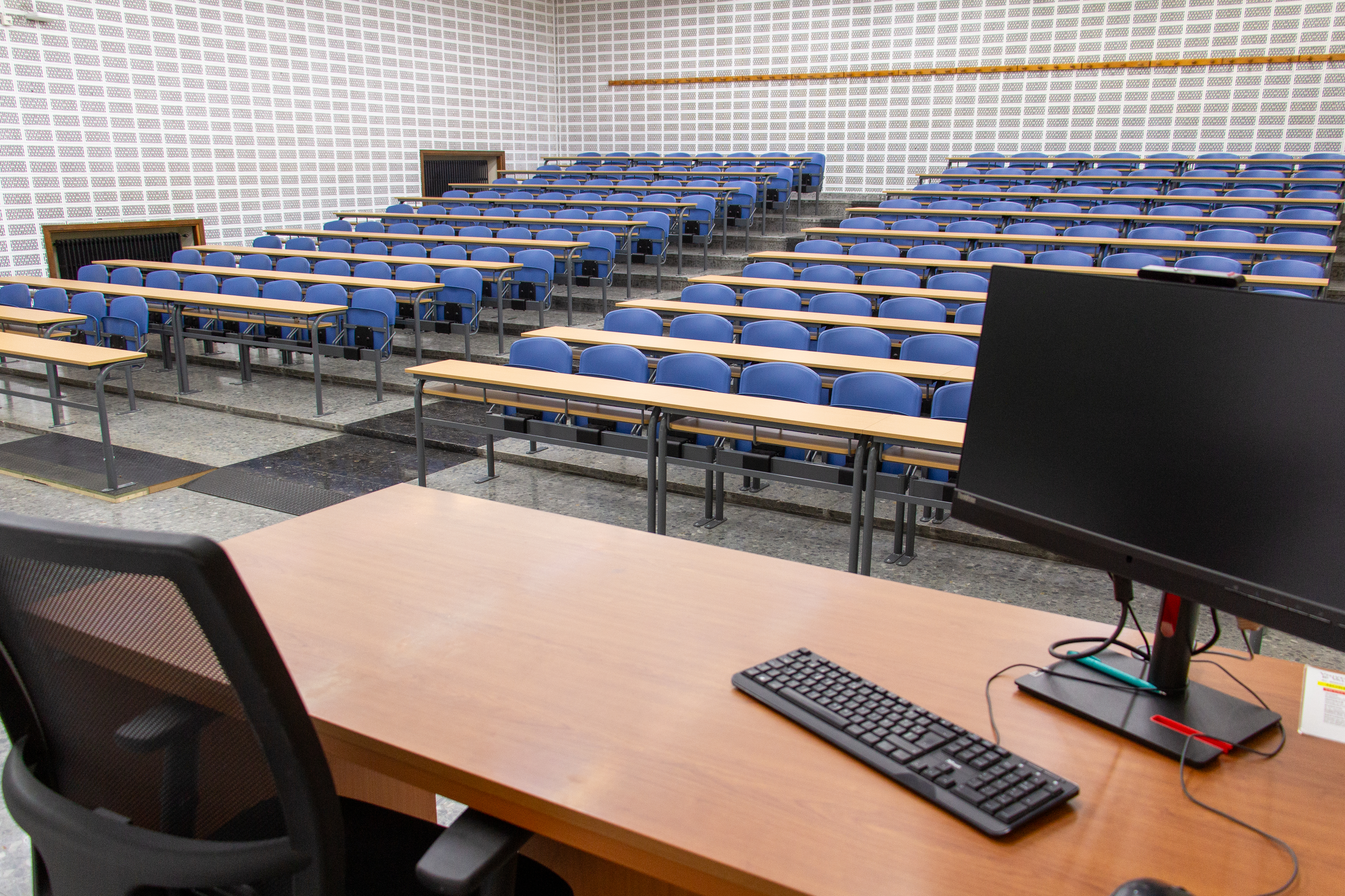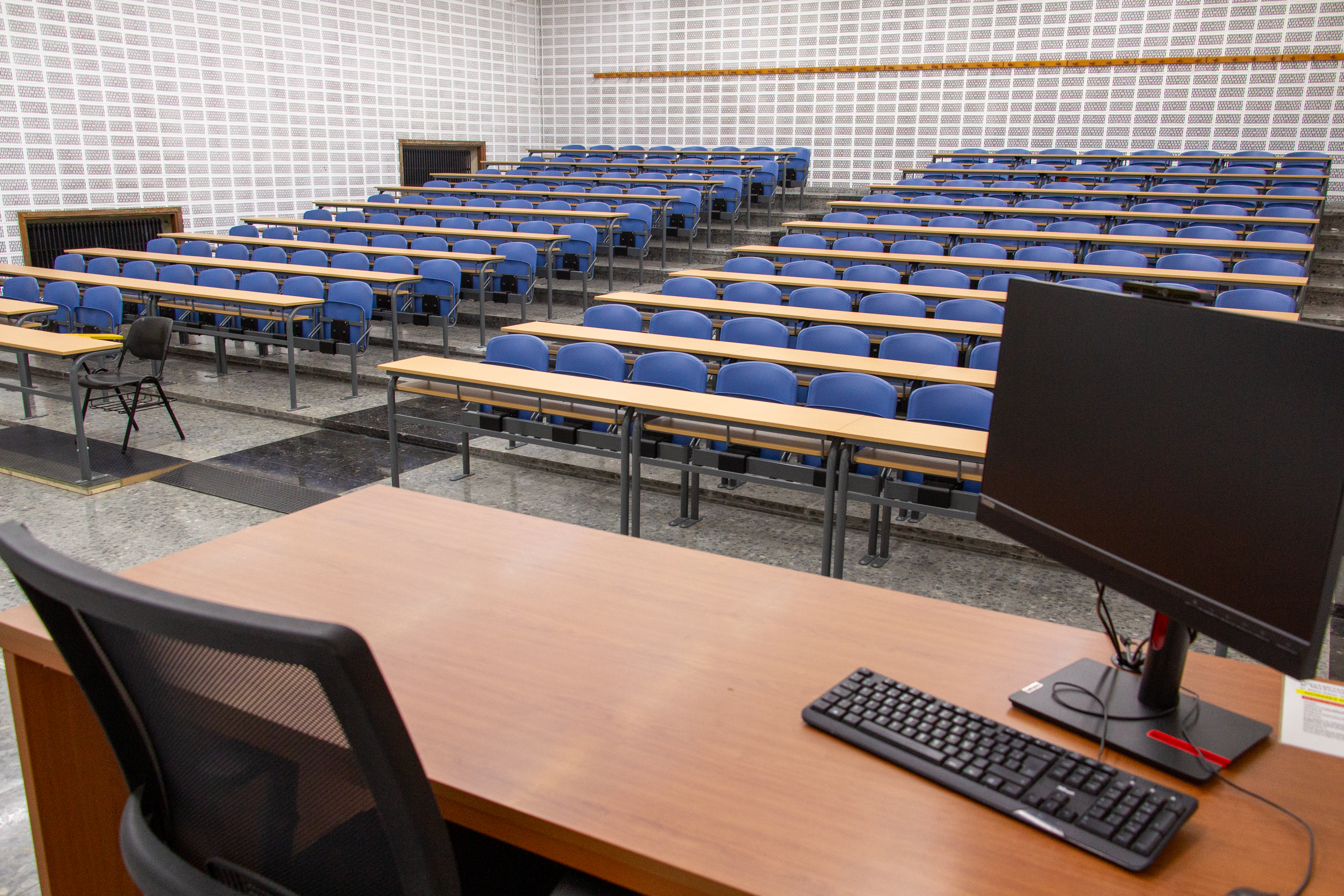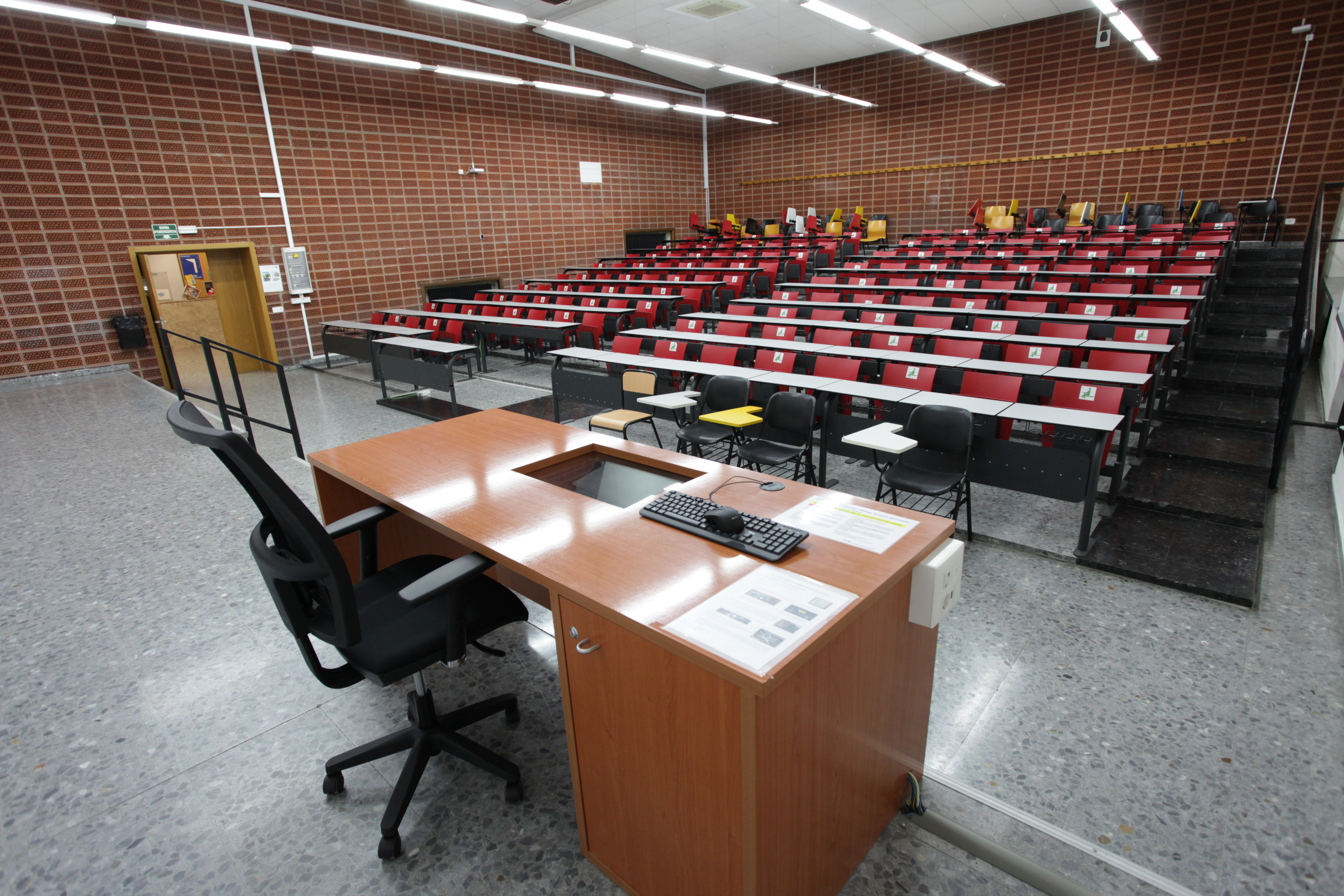 The classroom has 157 seats and 2 for people with reduced mobility. Fixed and adapted furniture. Platform. Computer equipment for teachers staff with multimedia desktop that includes microphone, battery charger and independent audiovisual system. Hybrid teaching system with built-in monitor camera included and another central camera on the ceiling. Video projector with pointer/slider for presentations. Darkening for projection by means of blinds. Chalk board. Sockets at workstations. Phone support with concierge staff. Security PA system. Wi-Fi