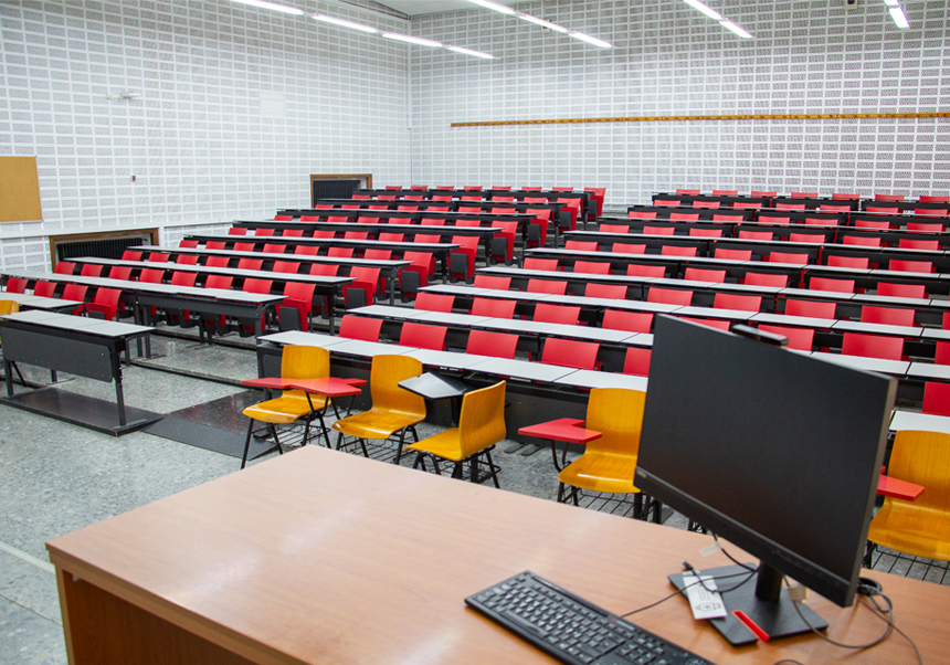 The classroom has 141 seats and 2 for people with reduced mobility. Fixed and adapted furniture. Platform. Computer equipment for teachers staff with multimedia desktop that includes microphone, battery charger and independent audiovisual system. Hybrid teaching system with built-in monitor camera included and another central camera on the ceiling. Video projector with pointer/slider for presentations. Darkening for projection by means of blinds. Chalk board. Sockets at workstations. Phone support with concierge staff. Security PA system. Wi-Fi