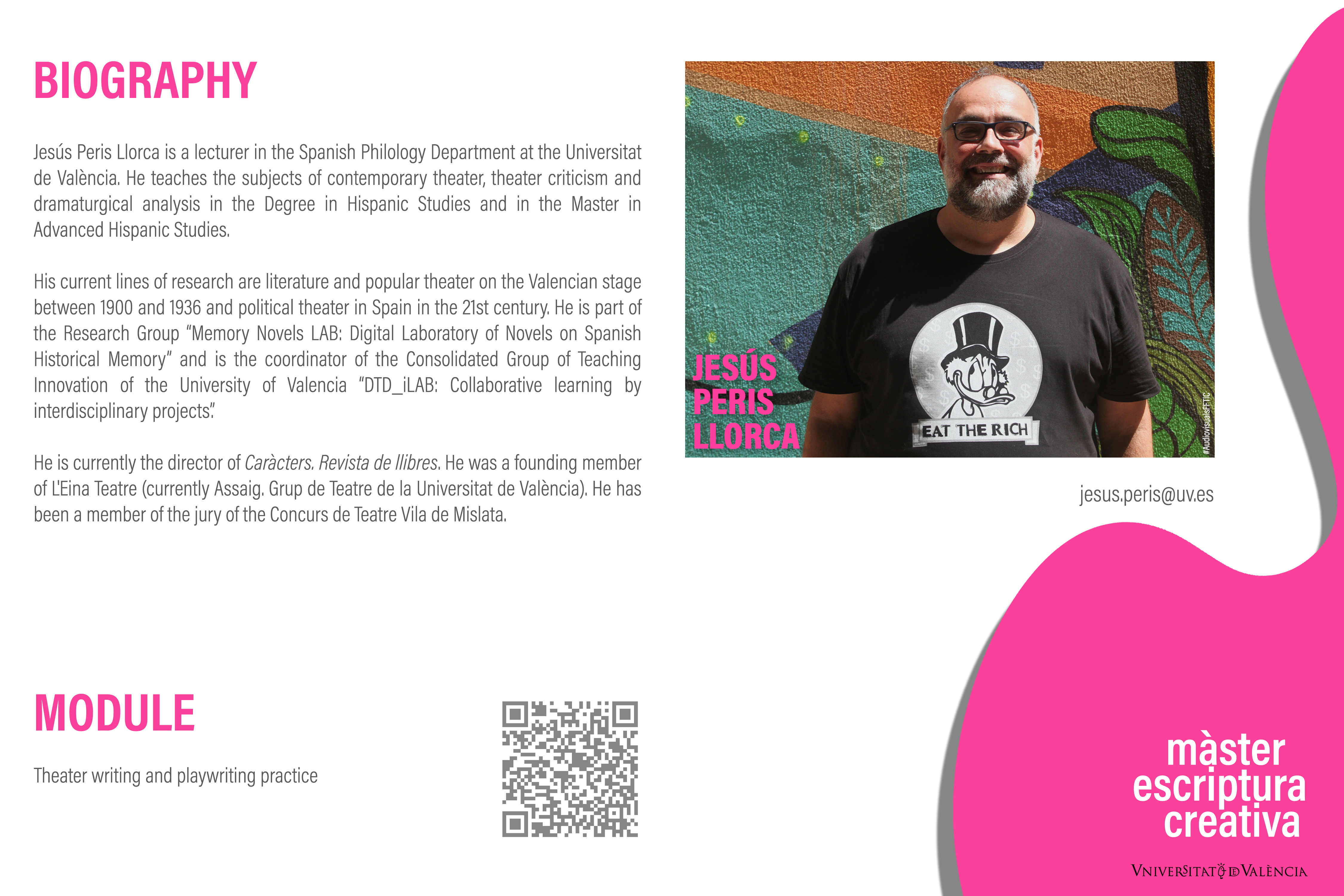 The Master of Permanent Education in Creative Writing (MEC) provides students with a comprehensive view of all issues related to literary training and creative writing. The training provided by the MEC subsequently favors employability, since it is presented as a space for theoretical and practical exploration. Students will thus have the opportunity to deepen both the techniques and the mechanisms of production of various literary discourses, with the aim of mastering the different aspects of professional writing. The MEC focuses on the relevance of different genres and aspects linked to literary tradition: fiction writing (mimetic and non-mimetic genres); theory and practice of poetry and theater; reception and reworking of tradition or forms of editing and tools for communication. Finally, students will individually develop a Master's Final Thesis of a creative nature where they will present an original writing project. The advantages of taking the Master of Permanent Education in Creative Writing (MEC) are: