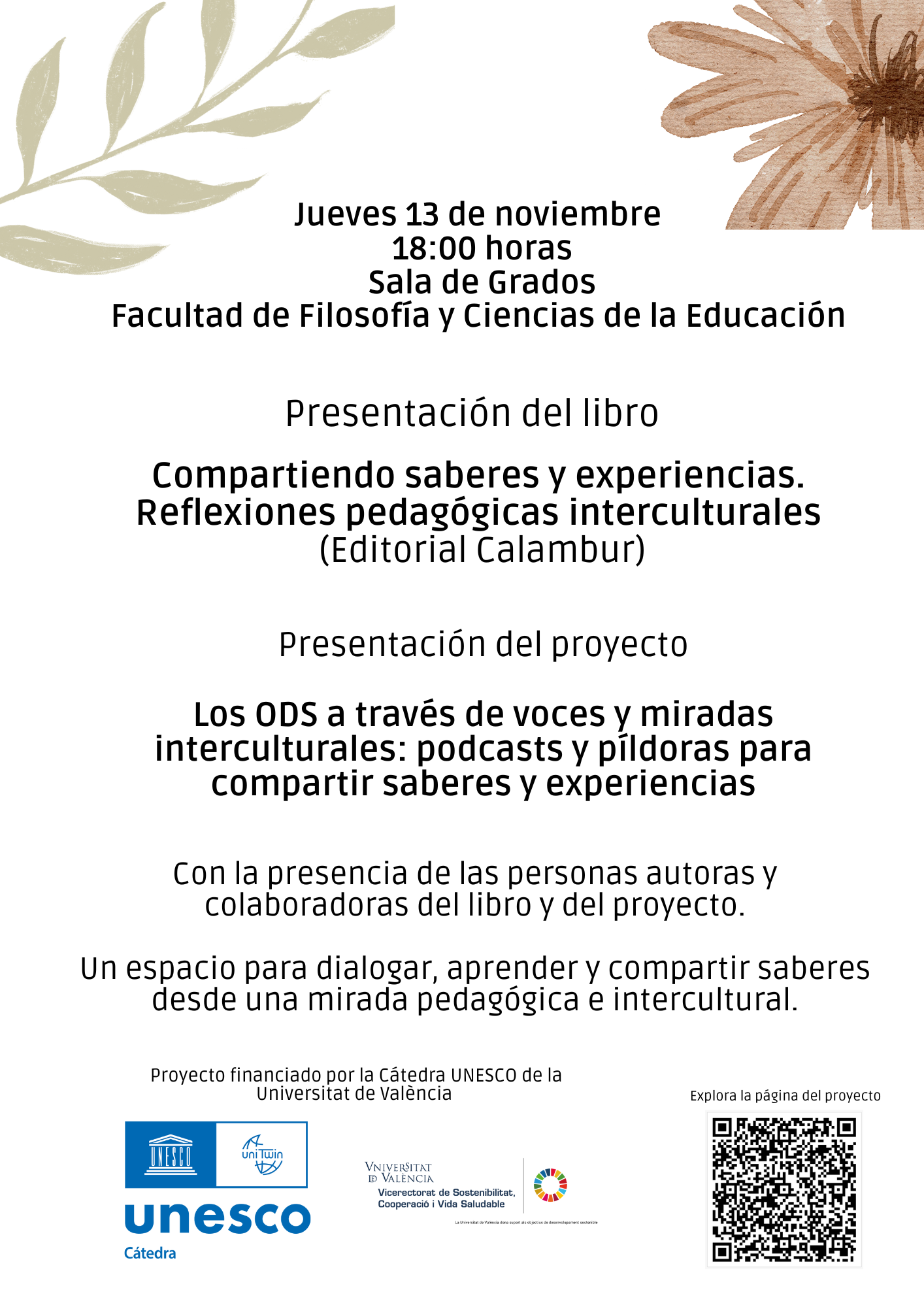 Dijous que ve 13 de novembre, a la Sala de Graus de la Facultat de Filosofia i Ciències de l'Educació, es durà a terme un esdeveniment dedicat a la reflexió pedagògica intercultural i a l'intercanvi d'experiències. Es presentarà el llibre "Compartint sabers i experiències. Reflexions pedagògiques interculturals" (Editorial Calambur), seguit per la presentació del projecte "Els ODS a través de veus i mirades interculturals: pòdcasts i píndoles per a compartir sabers i experiències".