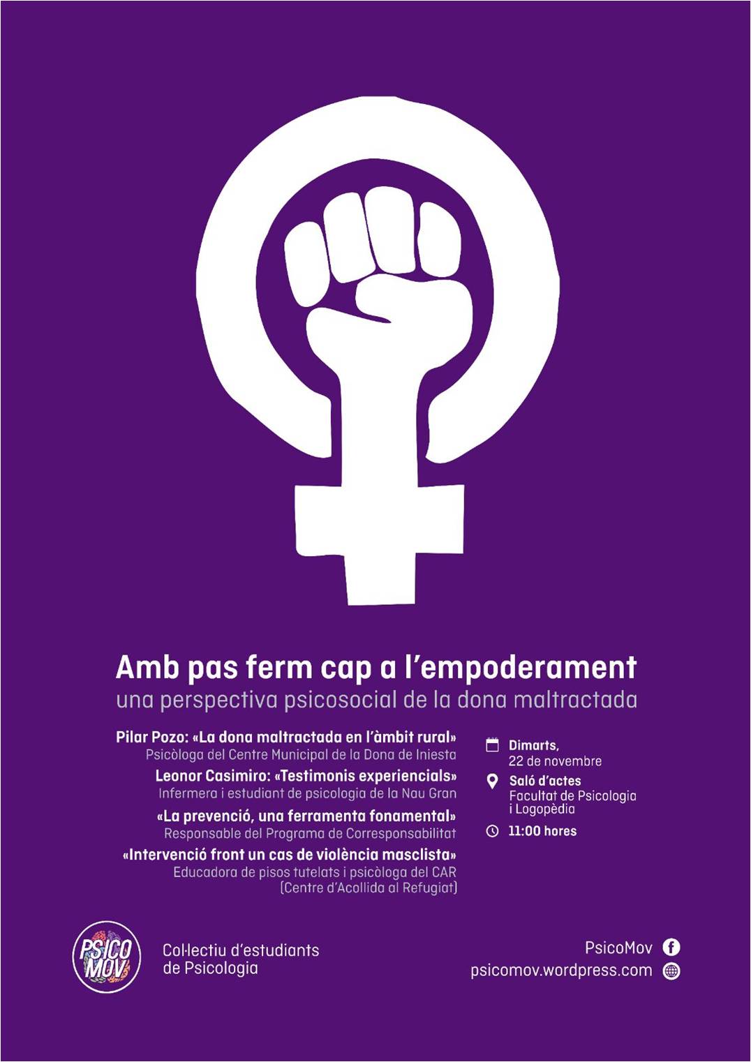 El martes 22 de noviembre a partir de las 11:00 se celebra en el Salón de Actos de la Facultat de Psicologia la Jornada que tiene como título “Amb pas ferm cap a l’empoderament: una perspectiva psicosocial de la dona maltractada”, organizada por el Colectivo de Estudiantes de Psicología PsicoMov.