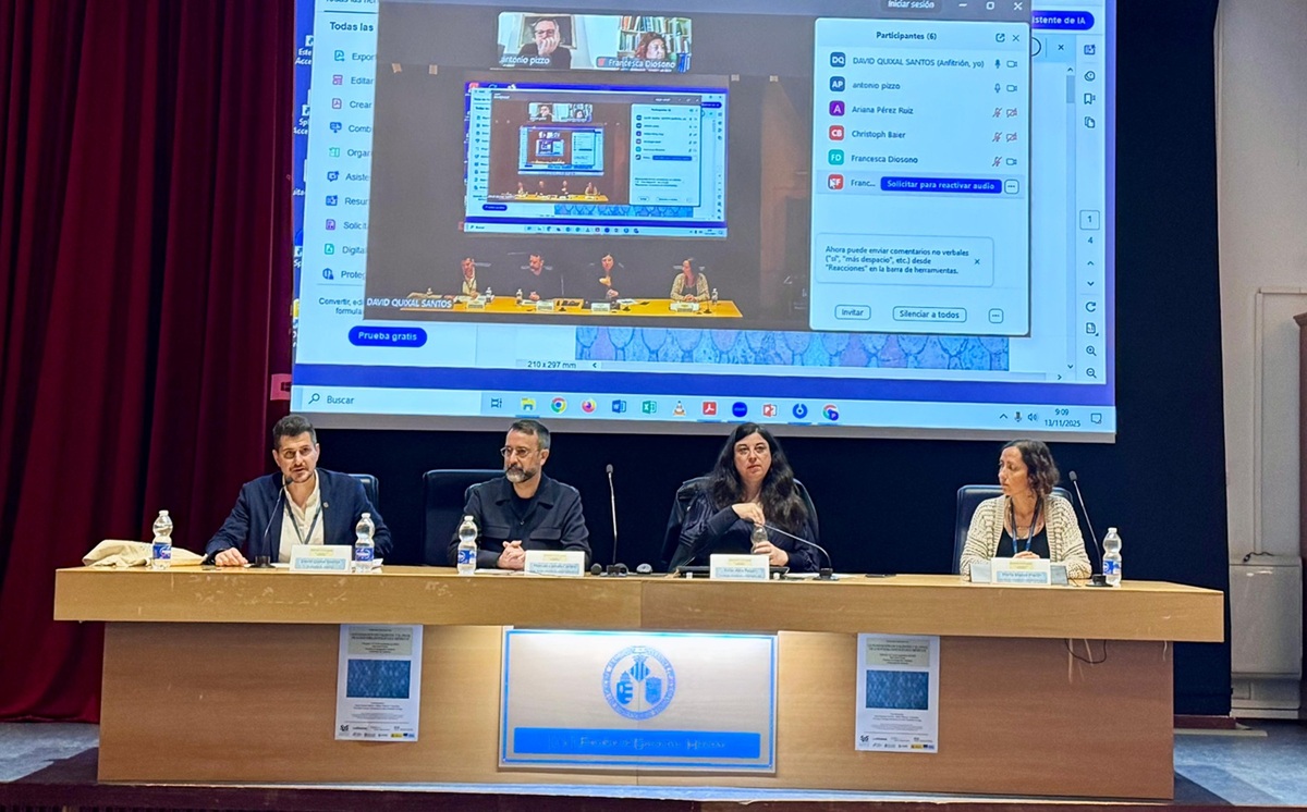 - Presentació del congrés. De dreta a esquerra: David Quixal, coordinador del seminari; Manuel Lomas, degà de la Facultat de Geografia i Història UV; Ester Alba, vicerectora de Cultura i Societat (UV); Marta Blasco, secretària del Departament de Prehistòria, Arqueologia i Història Antiga (UV); (en pantalla) Antonio Pizzo, director de la EEHAR-CSIC.