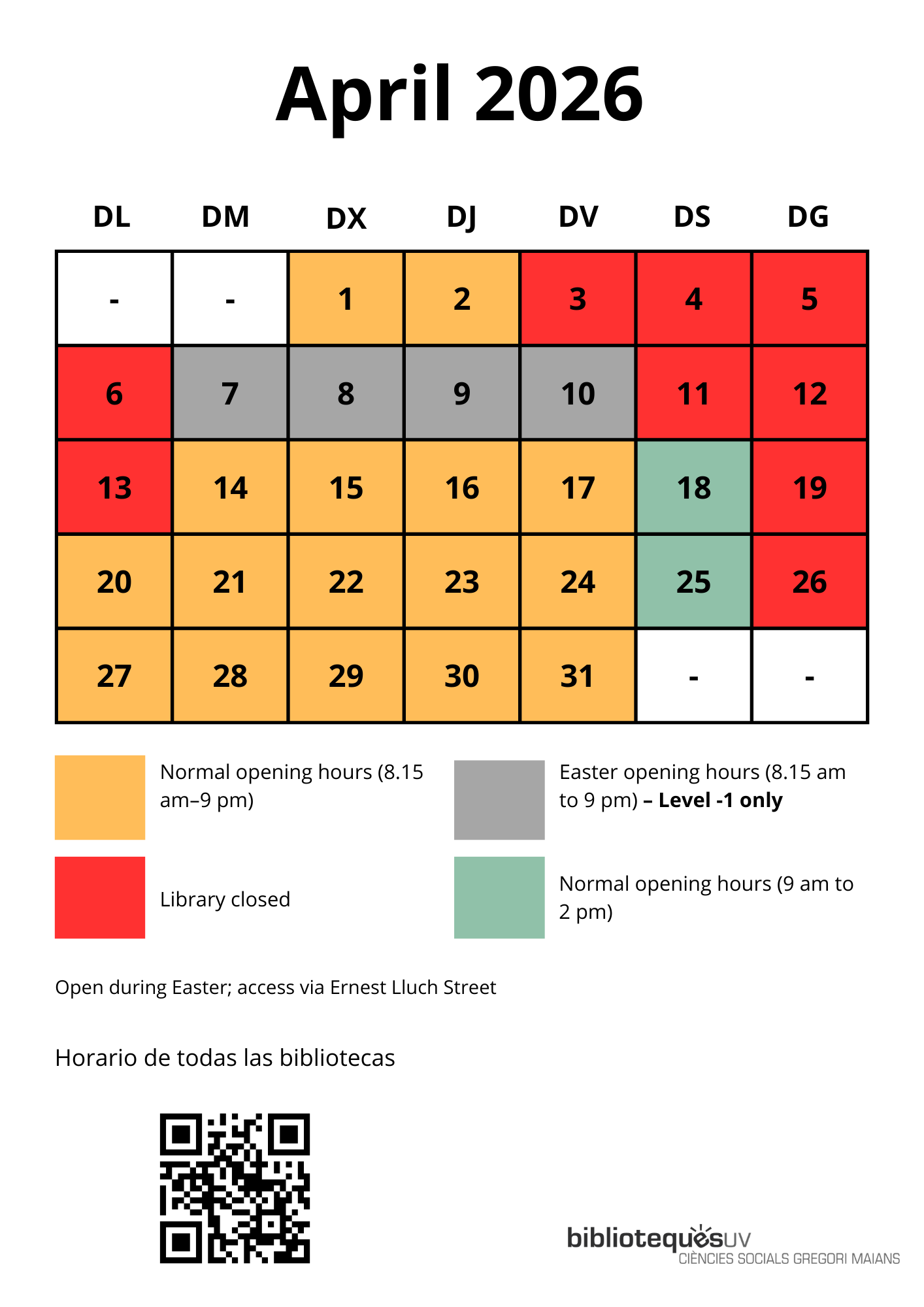 From Tuesday, April 7, through Friday, April 10, the Library will be open from 8:15 a.m. to 9:00 p.m. on Level -1 only, with access via the east entrance (Ernest Lluch Street). Service at the circulation desk, from 8.30 am to 1.45 pm.