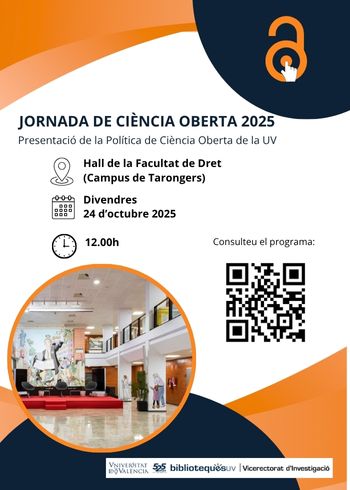 En la Jornada, introducida por Cristina Tomás, directora del Servicio de Bibliotecas y Documentación, Carlos Hermenegildo, vicerrector de Investigación de la UV, presentará la Política de Ciencia Abierta de la UV, aprobada el 7 de octubre en Consejo de Gobierno. Además, intervendrán como ponentes Beatriz Climent, Coordinadora de la Comisión de Ciencia Abierta, Joel González, Delegado de la Rectora para Acciones Estratégicas de Investigación, y Juan Pérez, Editor del Servicio de Publicaciones UV.