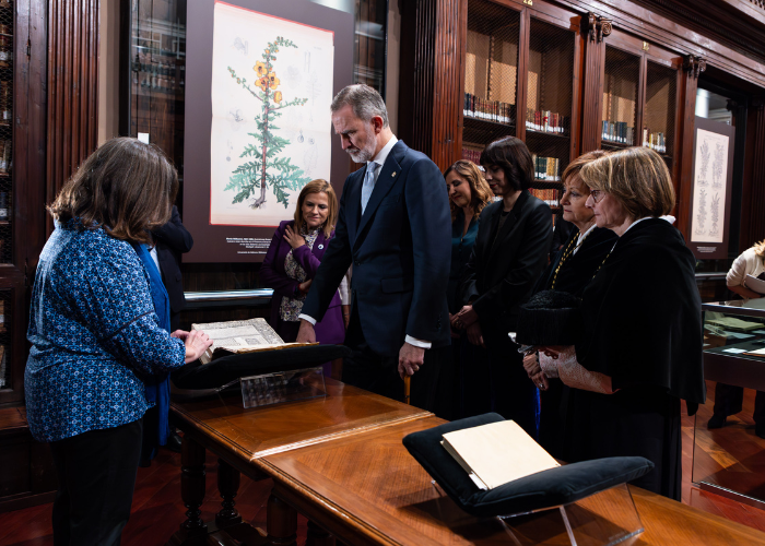 Al finalizar la ceremonia académica, Felipe VI, acompañado por la rectora y las principales autoridades valencianas, realizó una visita a la Biblioteca Histórica, atendido por Maria Jesús García Mateu, directora de la biblioteca. Durante el recorrido, pudo contemplar algunas de las joyas bibliográficas más destacadas del patrimonio universitario, como un ejemplar de la “Biblia de San Vicente Ferrer”, con anotaciones manuscritas del propio santo, que perteneció al Duque de Calabria (BH Ms. 45); el único ejemplar conocido del primer libro literario impreso en la península ibérica, “Obres e trobes en lahors de la Verge Maria” (BH CF/1); y un ejemplar del Tirant lo Blanc, incunable custodiado por la Biblioteca Histórica (BH inc. 39).
