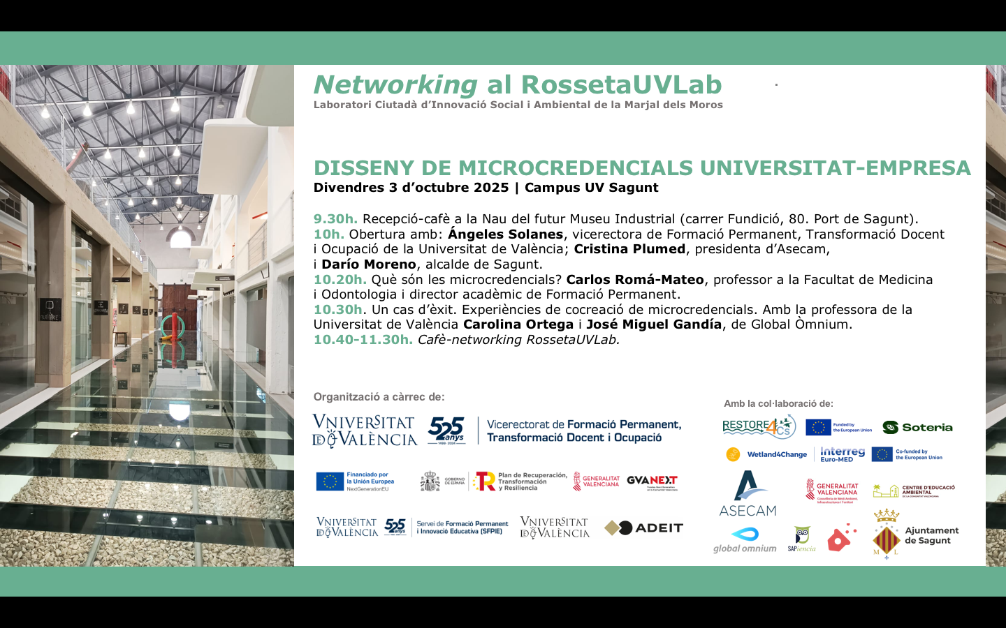 El Vicerrectorado de Formación Permanente, Transformación Docente y Ocupación de la Universitat de València ha organizado una jornada networking de presentación y codiseño de microcredenciales Universidad-Empresa en el RossetaUVLab de Sagunto. La sesión tendrá lugar el próximo 3 de octubre a la Nave del futuro Museo Industrial de Sagunto, de 9.30 a 11.30h (calle Fundición 80).