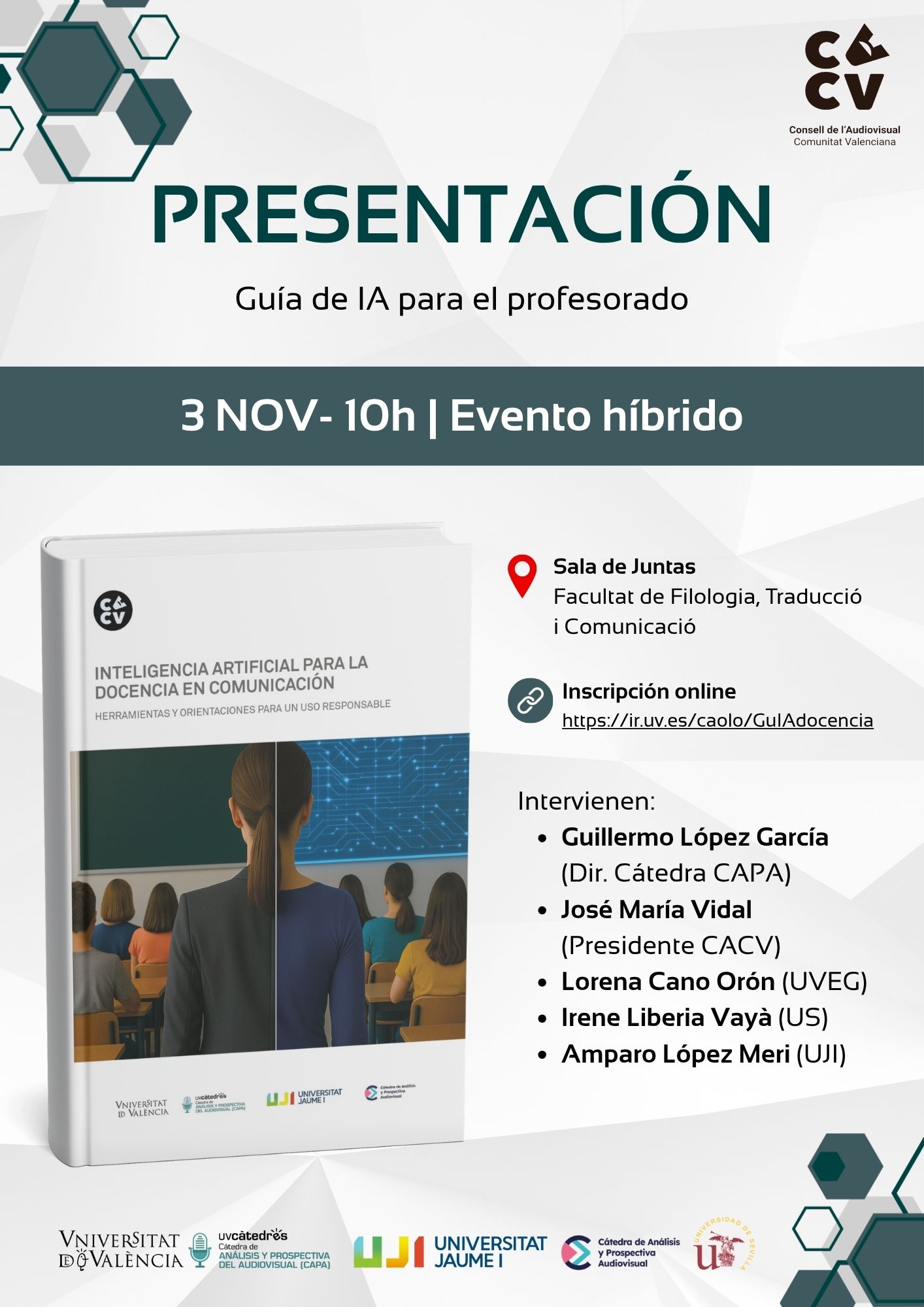 With this publication, the Chair of Audiovisual Prospects and Analysis of UV and UJI along with CACV strengthen their commitment with ethical and critical education in AI applied to communication. The guide aims to balance technological innovation with pedagogical reflection while providing tools to help professors integrate AI in classroom without losing any academic rigor or intellectual autonomy.