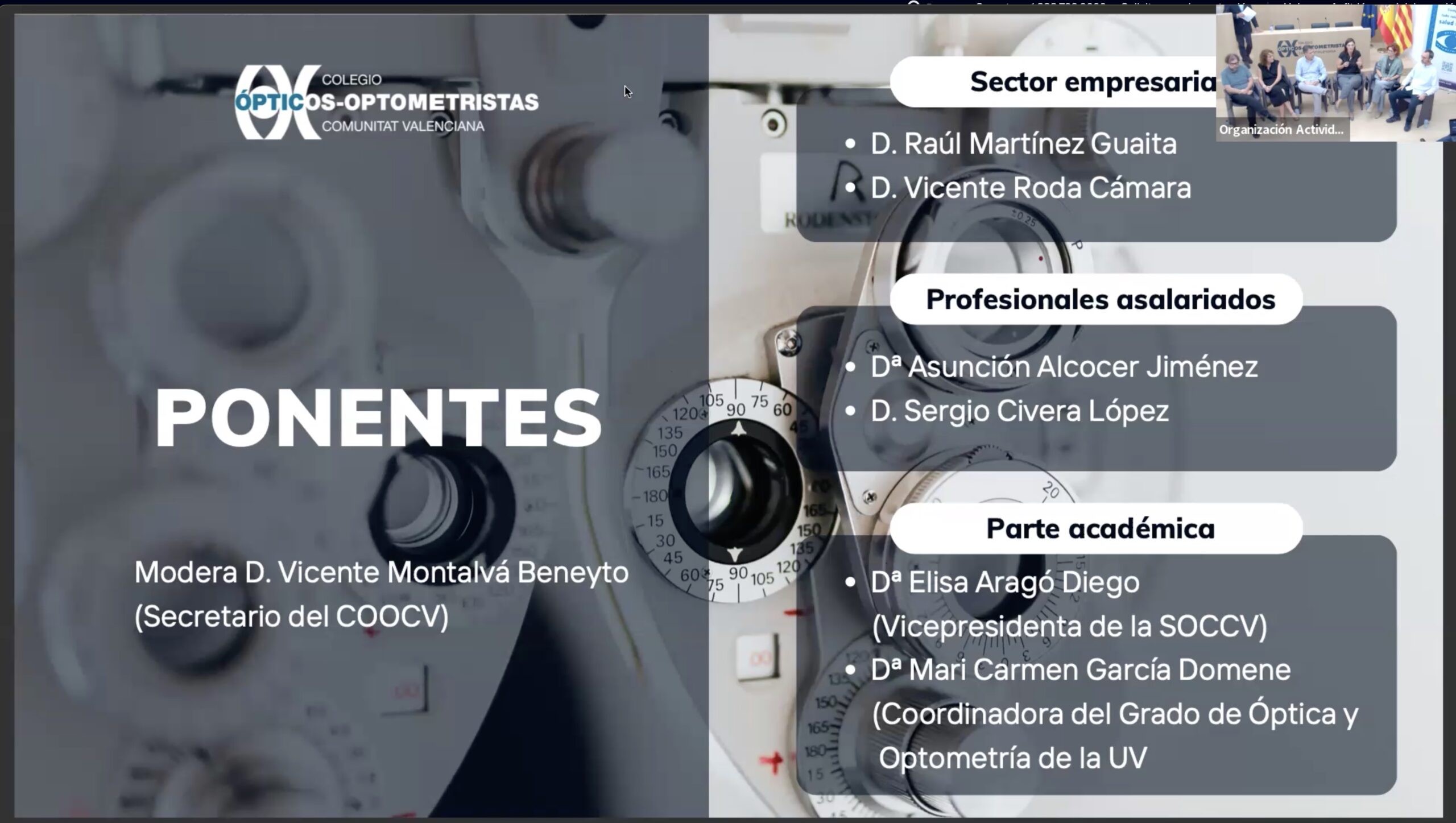 Dins dels actes programats, el Col·legi d'Òptics-Optometristes de la Comunitat Valenciana (COOCV), va celebrar en la seua seu la taula rodona "Present i Futur Laboral de l'Òptic-Optometrista. Estem preparats?", que va reunir diferents professionals per parlar de l'estat laboral actual de l'òptic-optometrista. En aquesta taula van participar optometristes del sector empresarial, professionals assalariats, i per la part acadèmica, Na Elisa Aragó Diego com a Vicepresidenta de la Societat d'Optometria i Contactologia de la Comunitat Valenciana (SOCCV), i la Coordinadora del Grau en Òptica i Optometria Na Mª Carmen García Domene.
