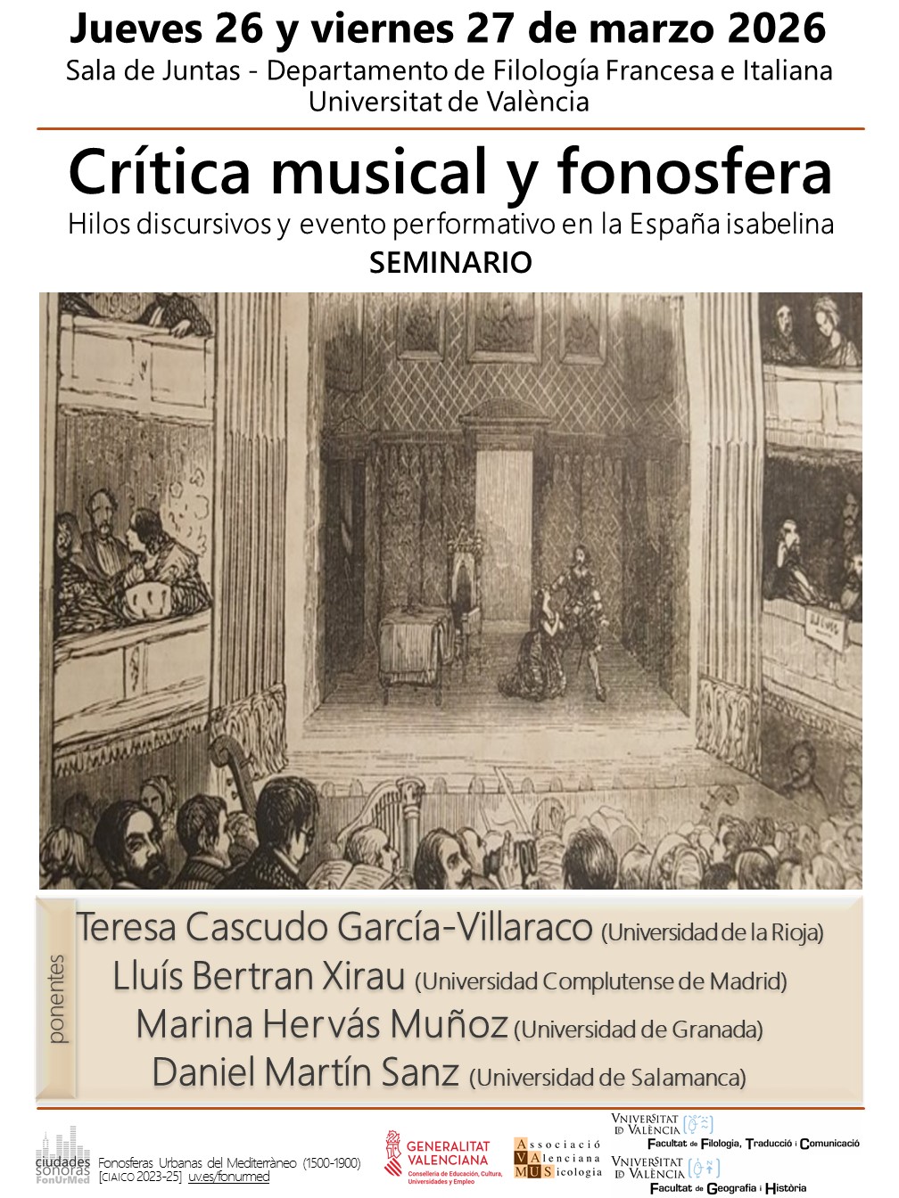 - 1st session: Thursday, 26/03/2026, 4:00pm. "Music criticism and phonosphere. Discursive thread and performative event in the Elizabethan Spain"