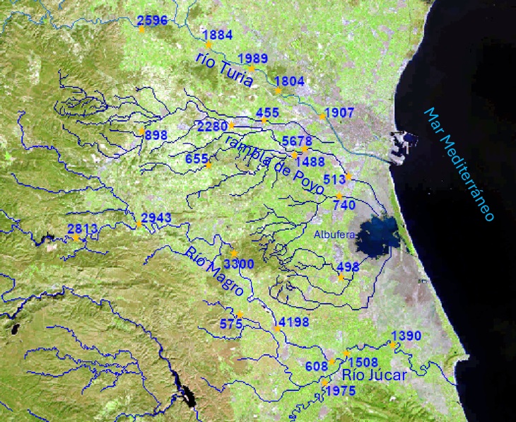 Así, el Poyo en Torrent registró 5678 m3 por segundo (un m3/seg equivale a 1000 litros en una sección de un metro por un metro, en un segundo); el máximo del Magro en Carlet fue de 4198 m3/seg; y el Turia en Pedralba registró un pico de 2596 m3/s.