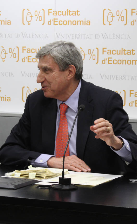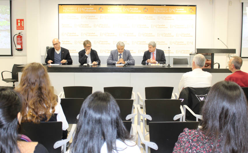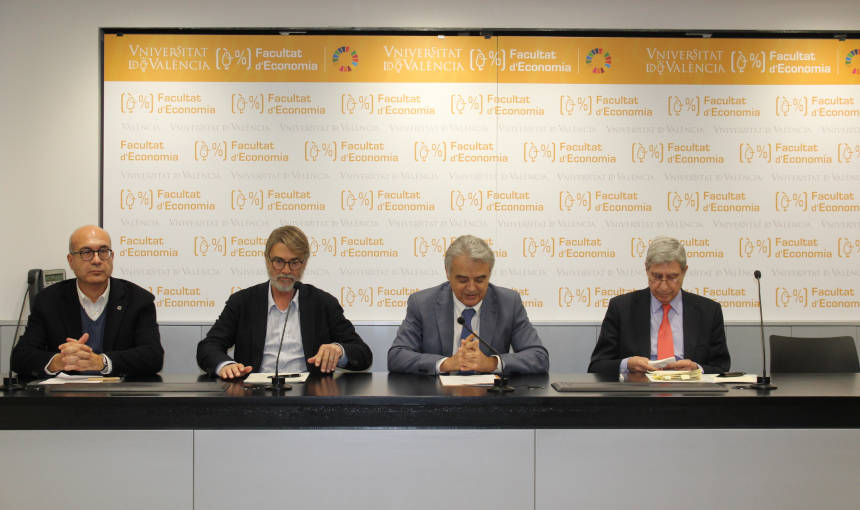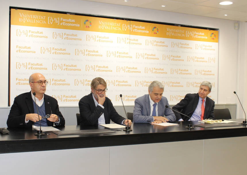 El acto inaugural del programa de conferencias, debates, mesas redondas y actividades culturales sobre la Unión Europea, que este año dedica la Universitat al 45 aniversario del hermanamiento entre las ciudades de València y Bolonia, ha estado protagonizado por el experto economista de la Universidad de Nebrija, a quien han acompañado este martes, día 3, en la Facultat d’Economia de la Universitat de València el secretario autonómico de Representación ante la UE y las Comunidades Autónomas, Pablo Broseta; el decano de la Facultat, Paco Muñoz; y el director del Centre de Documentació Europea UV, Cecilio Tamarit.