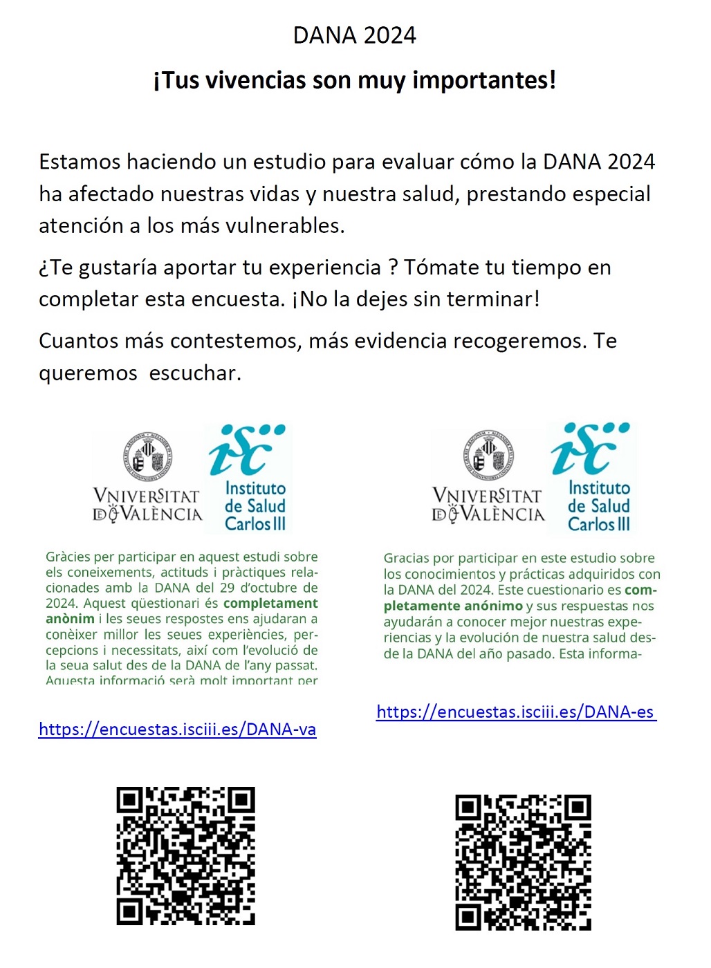 La encuesta, clicando en este enlace, analiza el estado de salud, la preparación ante futuras inundaciones, así como los apoyos y las ayudas recibidas. El objetivo de este estudio es poder ayudar, desde la ciencia, a estar mejor preparados y poder evitar una nueva catástrofe como la vivida. La encuesta es anónima.