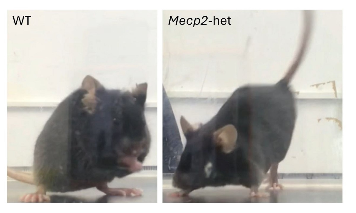Imatge annexa: En posar-les en contacte amb una superfície calenta (52o ), les ratolines sanes (WT), es llepen les potes, mentre que les malaltes (Mecp2-het) no són capaces de llepar-se les potes, i caminen cap arrere.