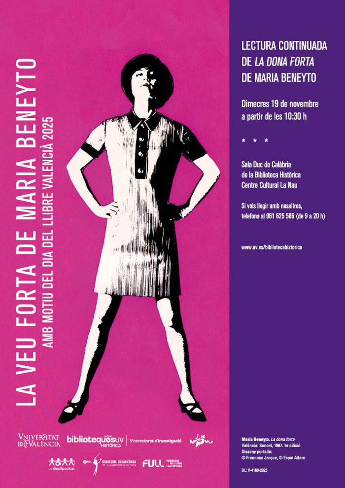 La Biblioteca Històrica de la Universitat de València celebrarà el pròxim 19 de novembre una jornada especial dedicada a l’escriptora valenciana Maria Beneyto (1920-2011), amb motiu del Dia del Llibre Valencià. Per seté any consecutiu, la institució se suma a aquesta commemoració mitjançant una lectura continuada, que en aquesta ocasió estarà centrada en la seua obra narrativa més emblemàtica, 'La dona forta'.