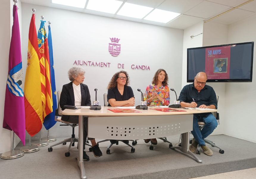 La directora del Centre Internacional de Gandia de la Universitat de València, Carme Melo i la regidora de Memòria Democràtica, Alícia Izquierdo, acompanyades del president de l’Associació Republicana de la Safor, Salvador Sanchis i la presidenta de l’Associació de Familiars de Víctimes del Franquisme a Gandia, Núria Martí, entitats col·laboradores en l'organització d’aquestes jornades, presentaven en la casa consistorial el programa d’activitats de les Jornades de Memòria Democràtica: «50 anys de la mort del dictador. La memòria continua en peu. Per les víctimes del silenci, pels qui encara esperen justícia».