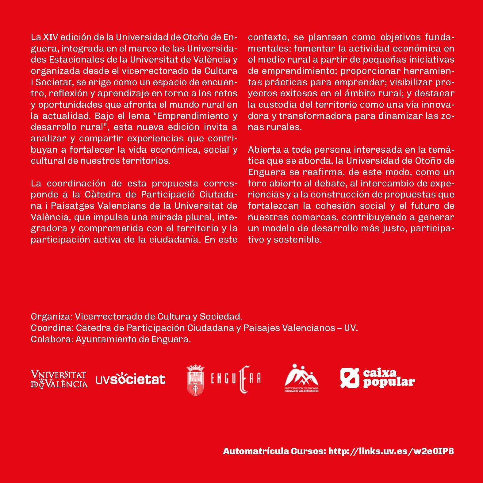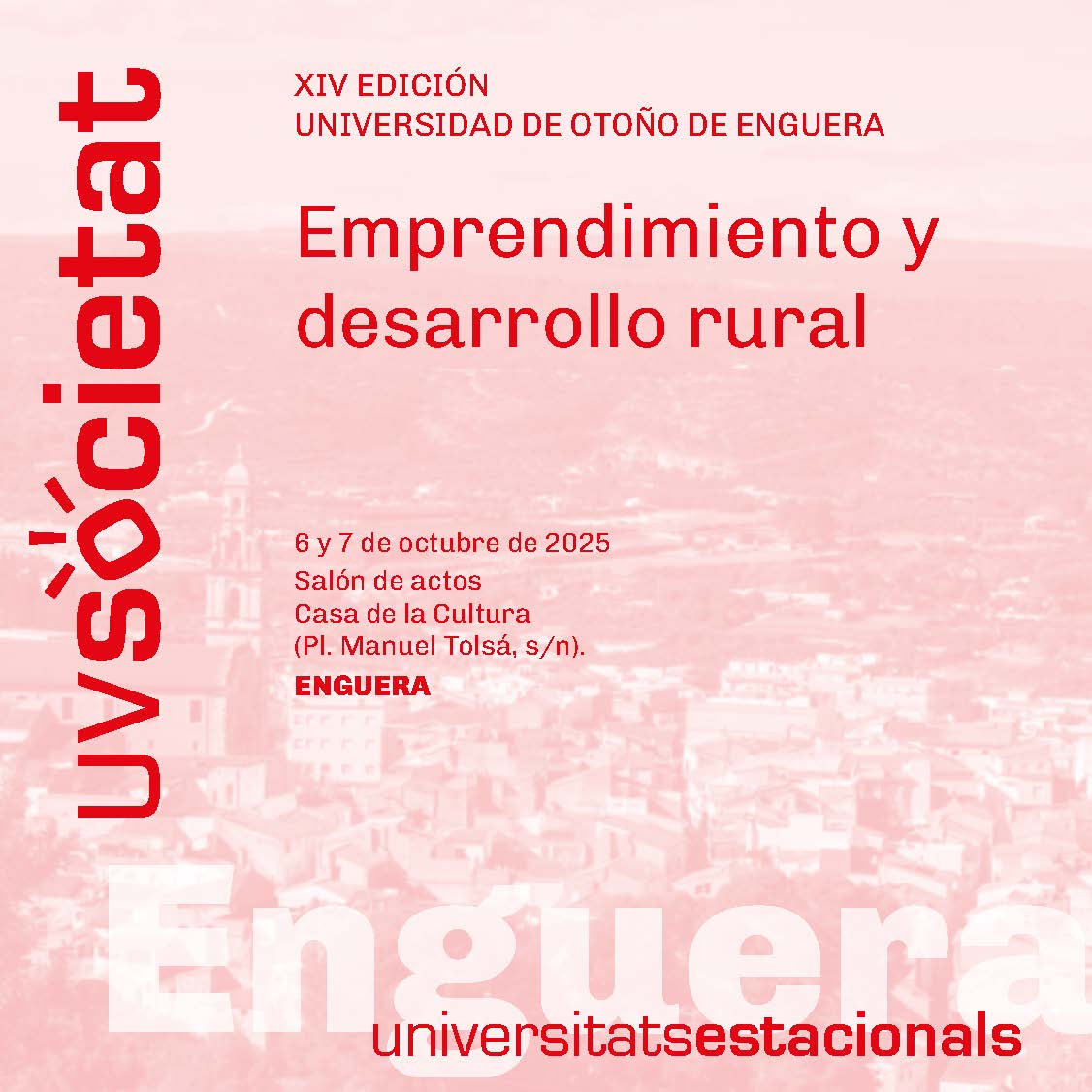La XIV edición de la Universidad de Otoño de Enguera, integrada en el marco de las Universidades Estacionales de la Universitat de València y organizada desde el vicerrectorado de Cultura i Societat, se erige como un espacio de encuentro, reflexión y aprendizaje en torno a los retos y oportunidades que afronta el mundo rural en la actualidad. Bajo el lema “Emprendimiento y desarrollo rural”, esta nueva edición invita a analizar y compartir experiencias que contribuyan a fortalecer la vida económica, social y cultural de nuestros territorios.