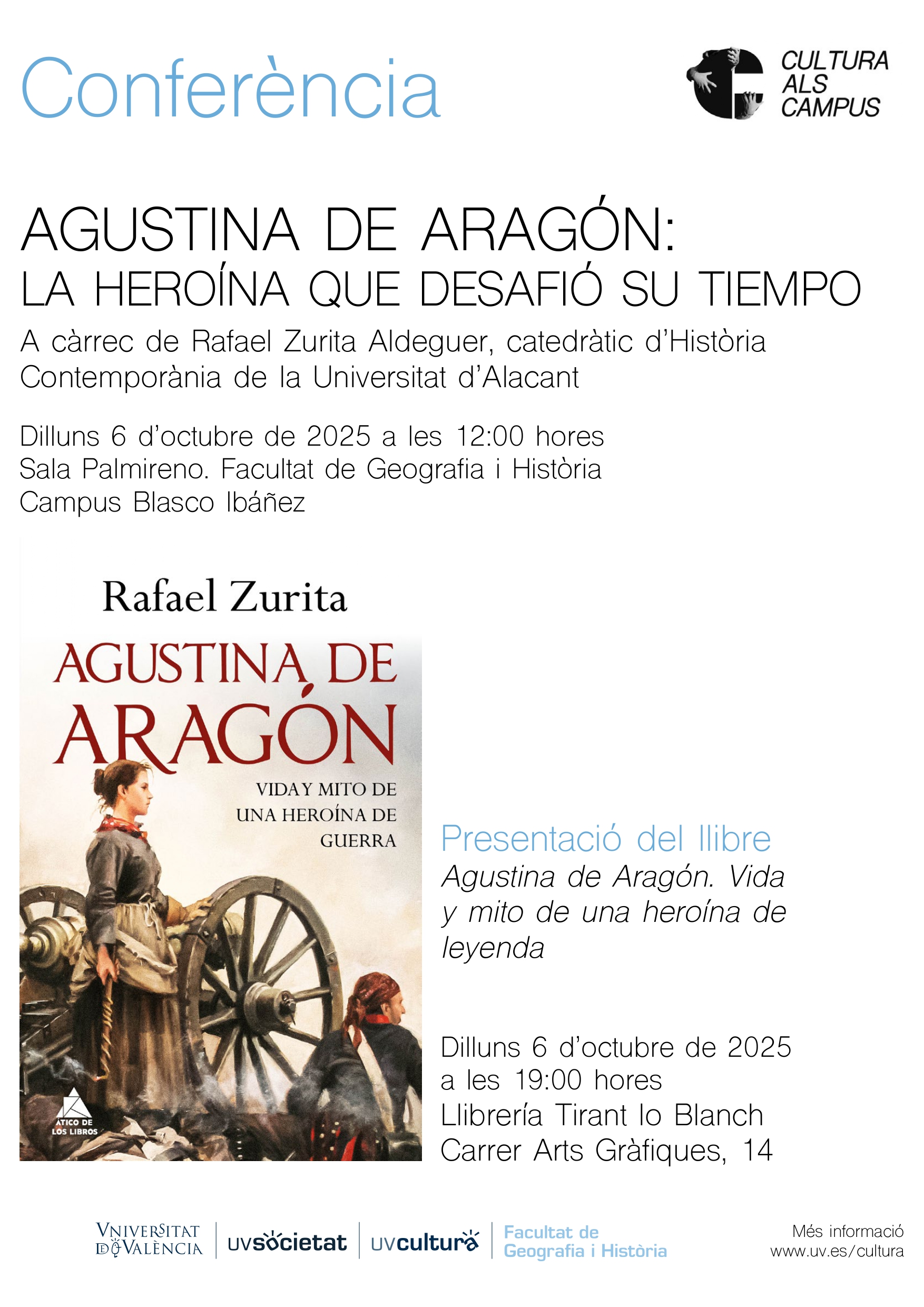 El lunes 6 de octubre, a las 12h, en la Sala Palmireno de la Facultat de Geografia i Història, en pleno campus de Blasco Ibáñez, el catedrádico de historia contemporánea de la Universidad de Alicante, Rafael Zurita, ofrecerá una conferencia sobre Agustina de Aragón, con las novedades aportadas por investigaciones recientes que aclaran la realidad de la vida de aquella mujer valiente, más allá del mito.