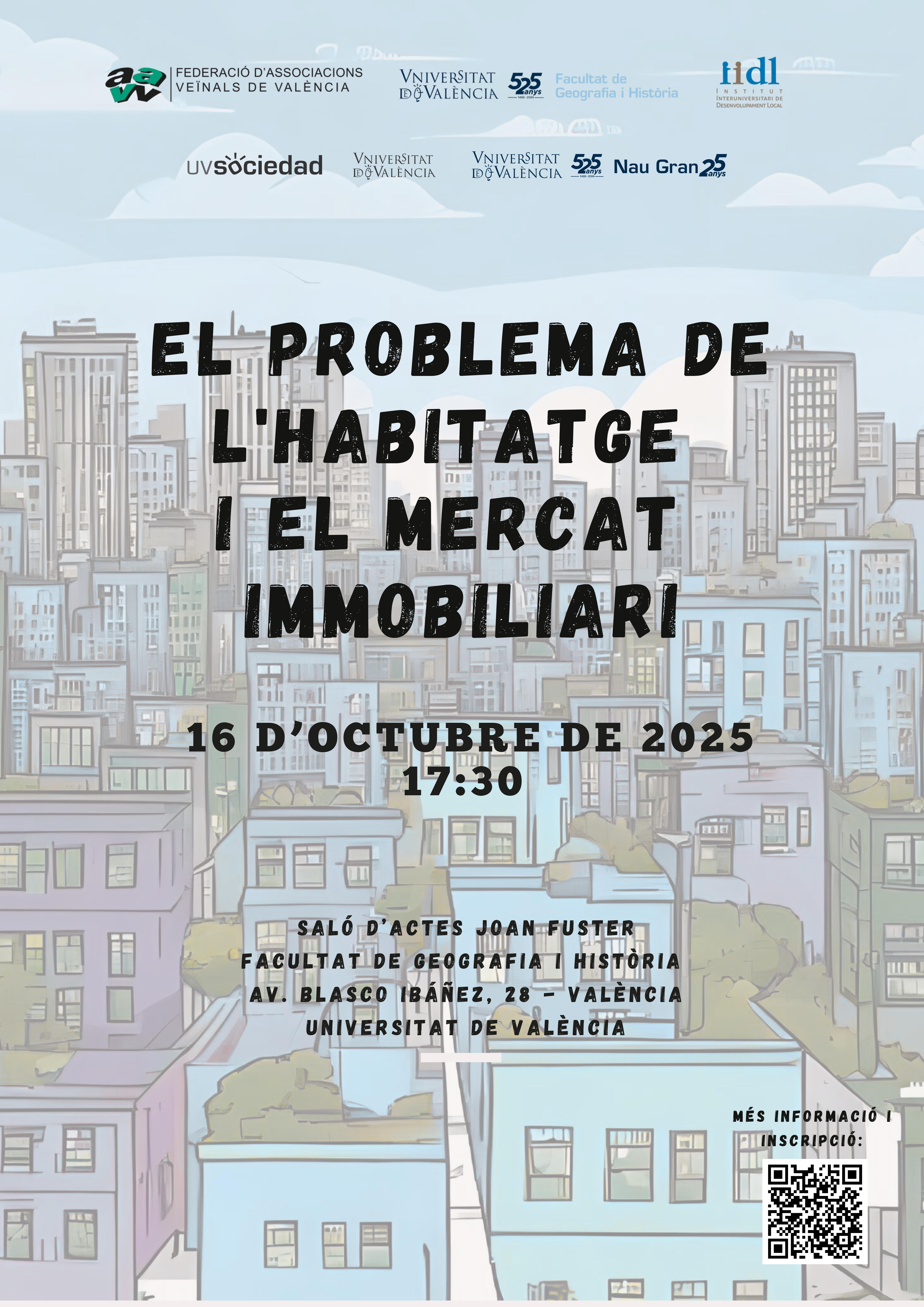 El próximo 16 de octubre del 2025 a las 17:30h tendrá lugar en el salón de actos Joan Fuster de la Facultat de Geografia i Història una conferencia que lleva por título “EL PROBLEMA DE LA VIVIENDA Y EL MERCADO INMOBILIARIO”. Contará con la intervención del Dr. Santiago Carbó, que tratará el tema del mercado inmobiliario y la política de vivienda en España, y también con la Dra. Gloria María Caravantes, que tratará el tema del derecho de la vivienda y su aplicación actual a la sociedad.