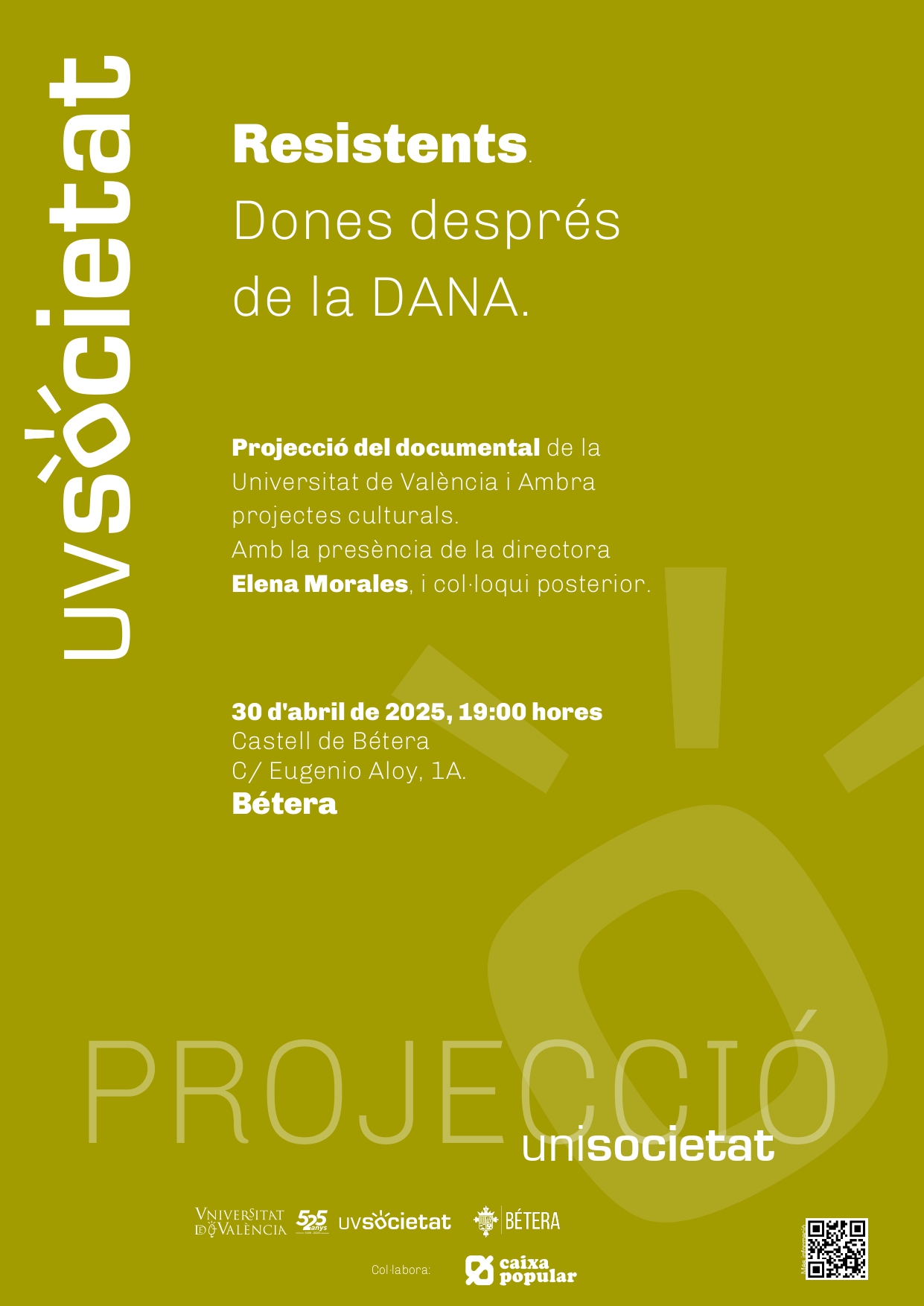La Universitat de València, a través del programa Unisocietat, va presentar el 7 de març el documental Resistents: Dones després de la DANA, una producció dirigida per la periodista Elena Morales que recull huit històries de dones que han viscut, viuen o estan relacionades amb la DANA que va afectar diverses comarques de la província de València el 29 d'octubre de 2024, especialment l'Horta Sud.