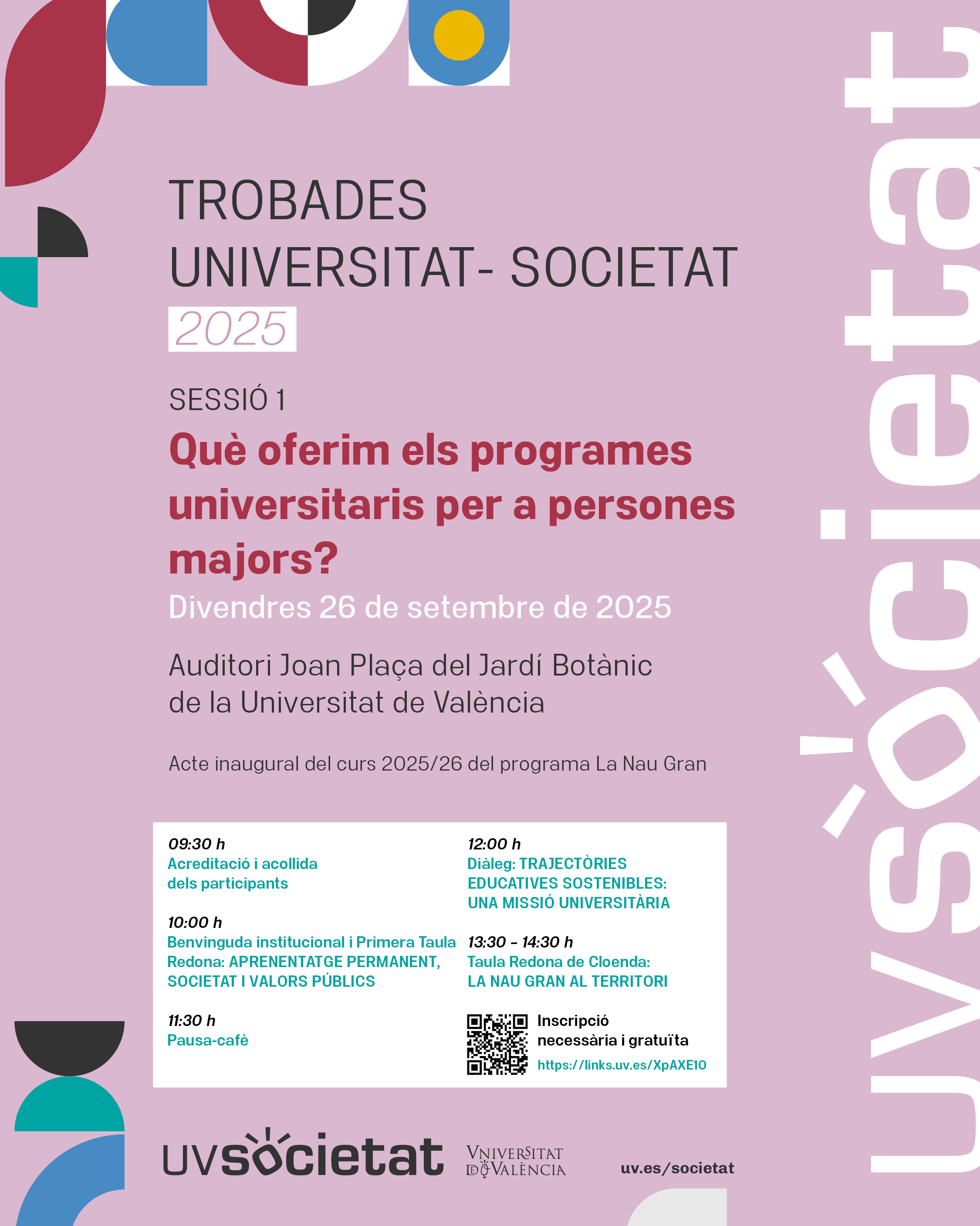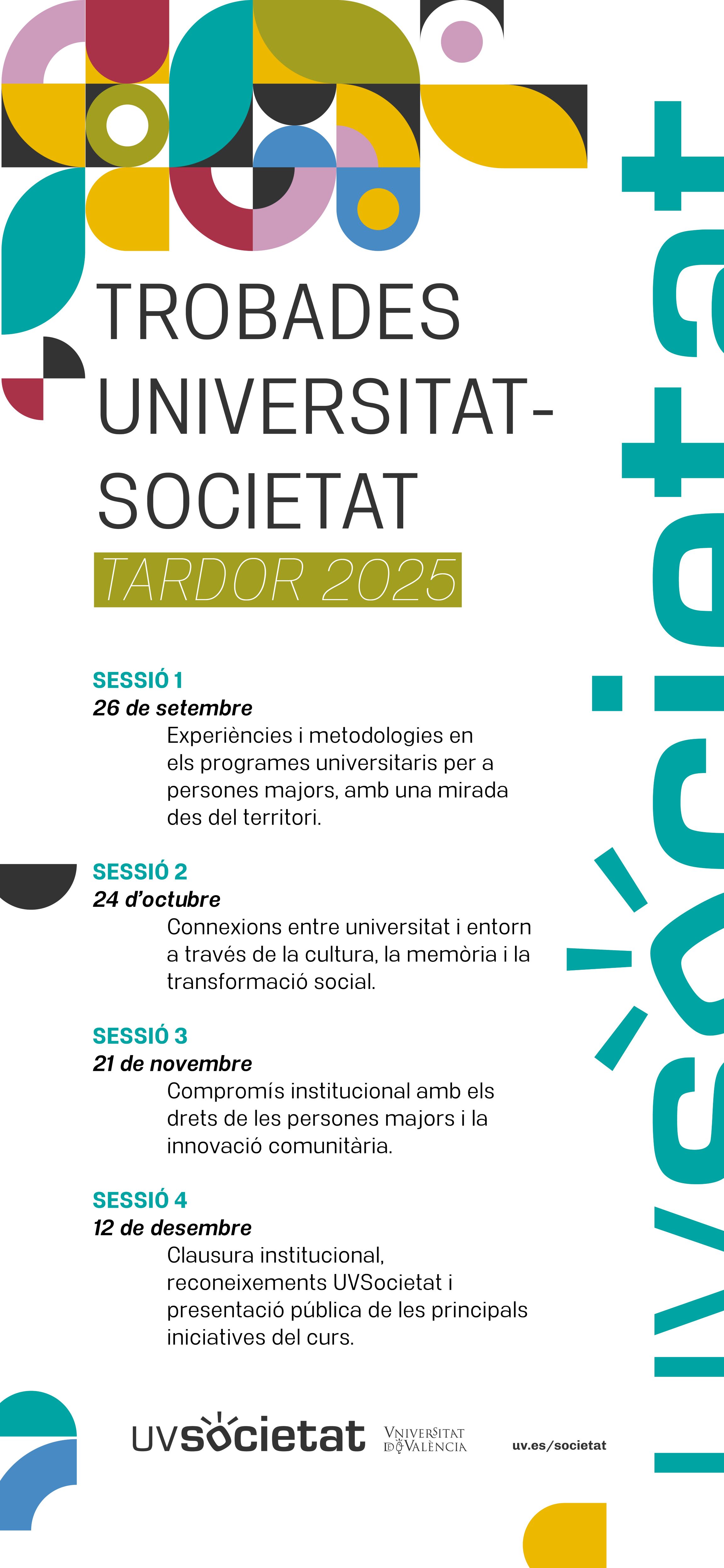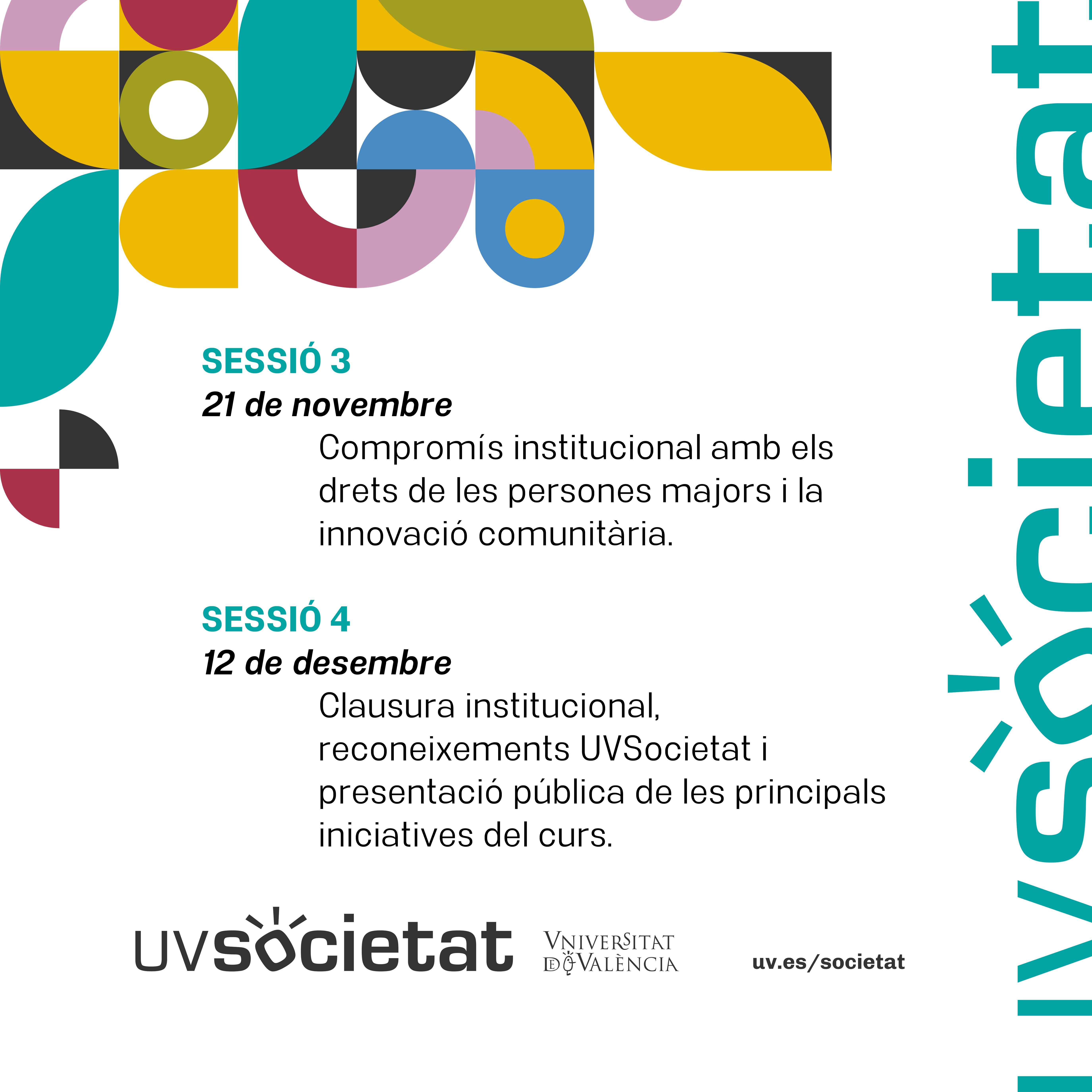 • Sessió 4 (12 de desembre): Clausura institucional, reconeixements UVSocietat i presentació pública de les principals iniciatives del curs.