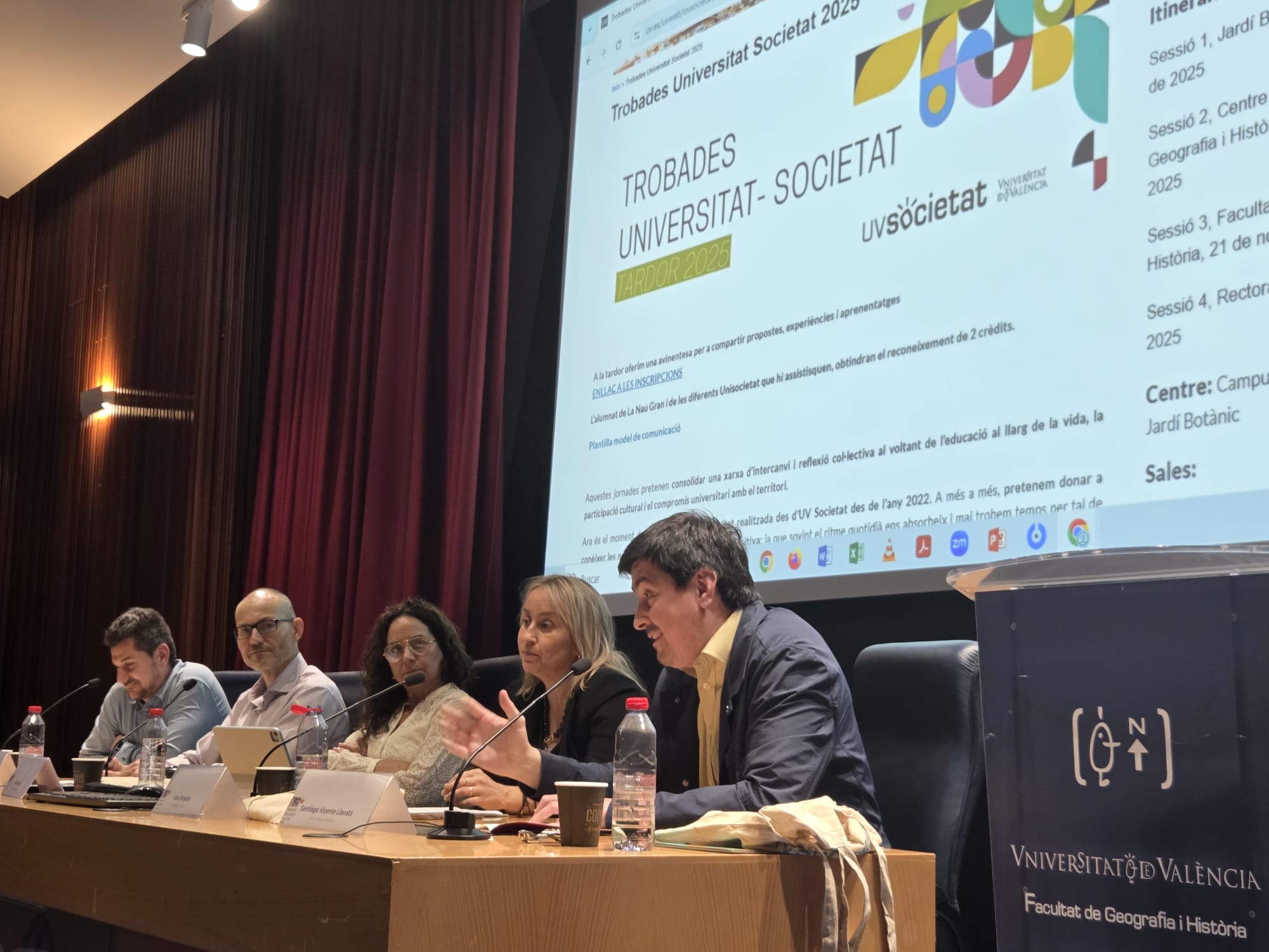 Després ens traslladàrem a la Facultat de Geografia i Història a dinar compartint taula amb persones vingudes d’altres seus de la formació permanent universitària. I a les 16h, diversos responsables d’activitats innovadores d’aprenentatge al llarg de la vida en el territori dialogaren, entre ells i amb el públic, per tal de presentar les seues experiències i plantejar un horitzó de millora i reivindicació del paper de la gent major en l’aportació a l’entorn i el valor de la curiositat. Hi participaren David Quixal, Emilio Iranzo, Gora Zaragoza i Santiago Vicente, en un debat moderat per Ana Sales.