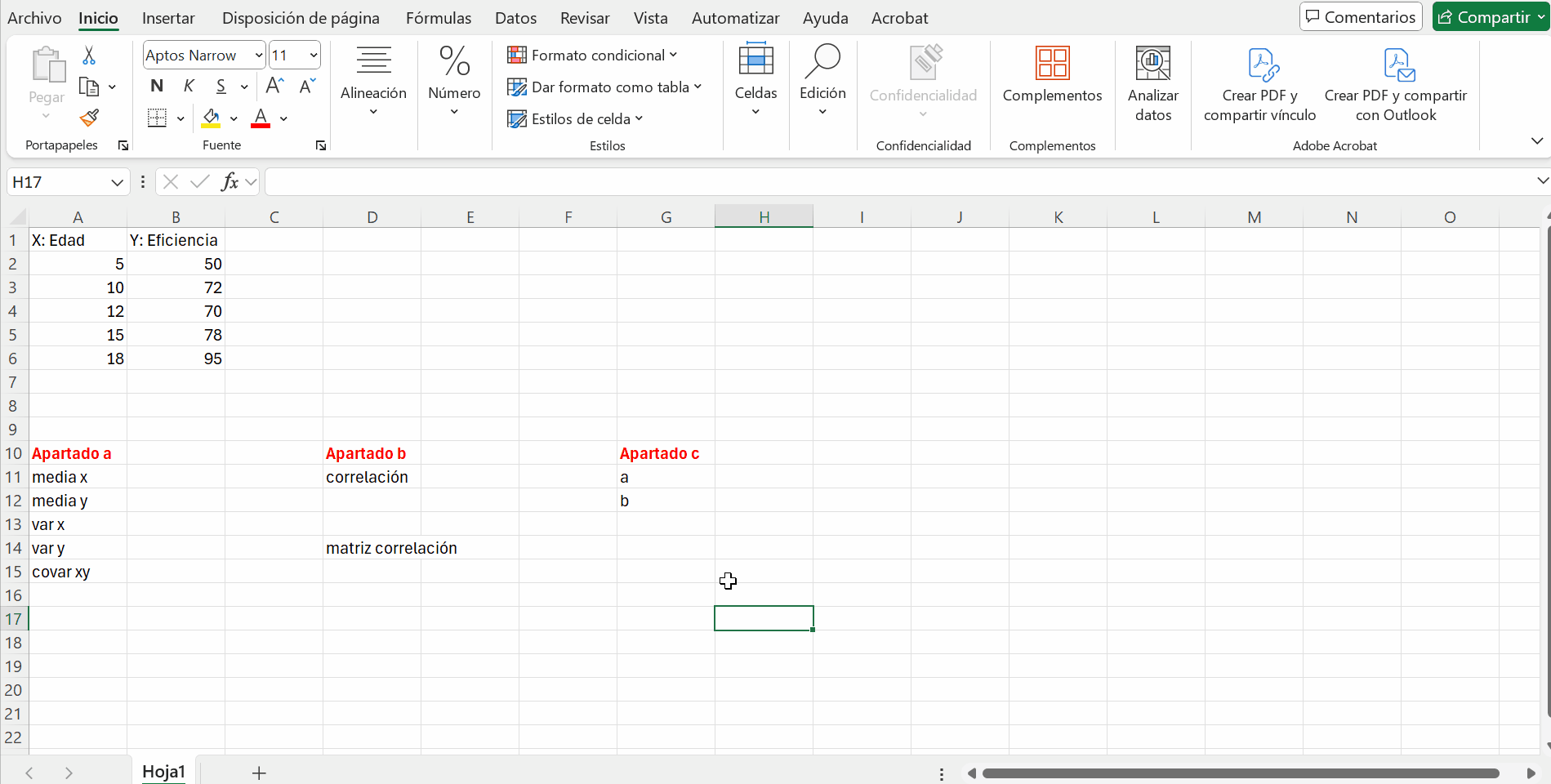 | X:Edad | Y:Eficiencia | \(x_i-\bar{x}\) | \(y_i-\bar{y}\) | \((y_i-\bar{y})^2\) | \((x_i-\bar{x})\cdot (y_i-\bar{y})\) |