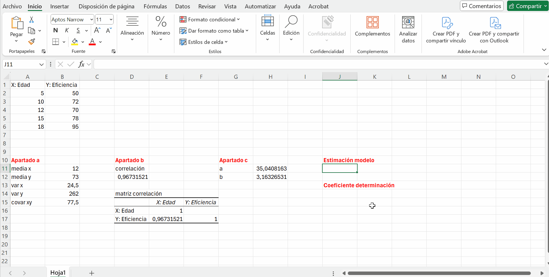 Para corrobar esta impresión que nos hemos hecho de la observación del diagrama de dispersión, calculamos la covarianza y la correlación. Lo hacemos en las celdas O1 y O2, respectivamente.