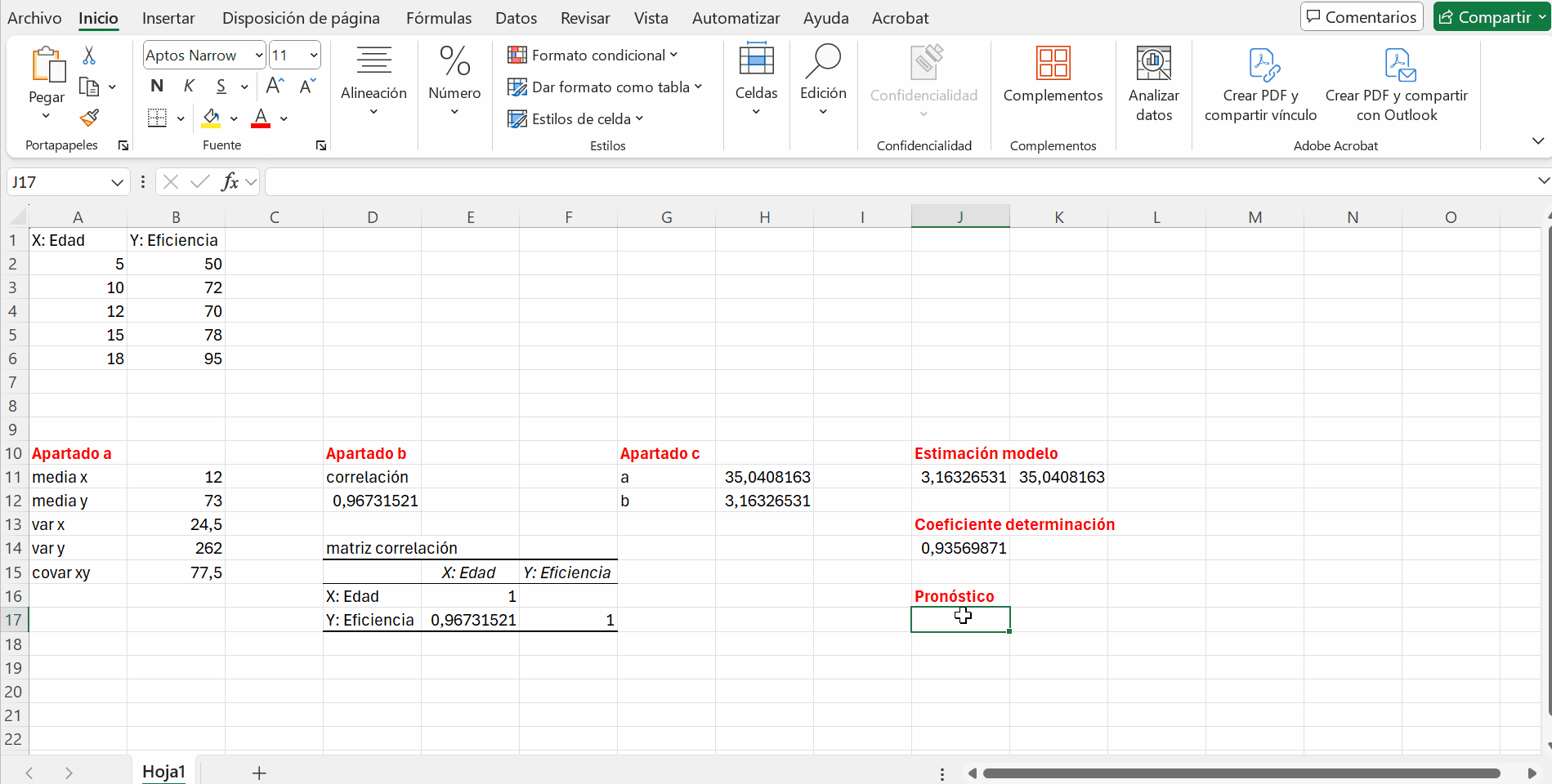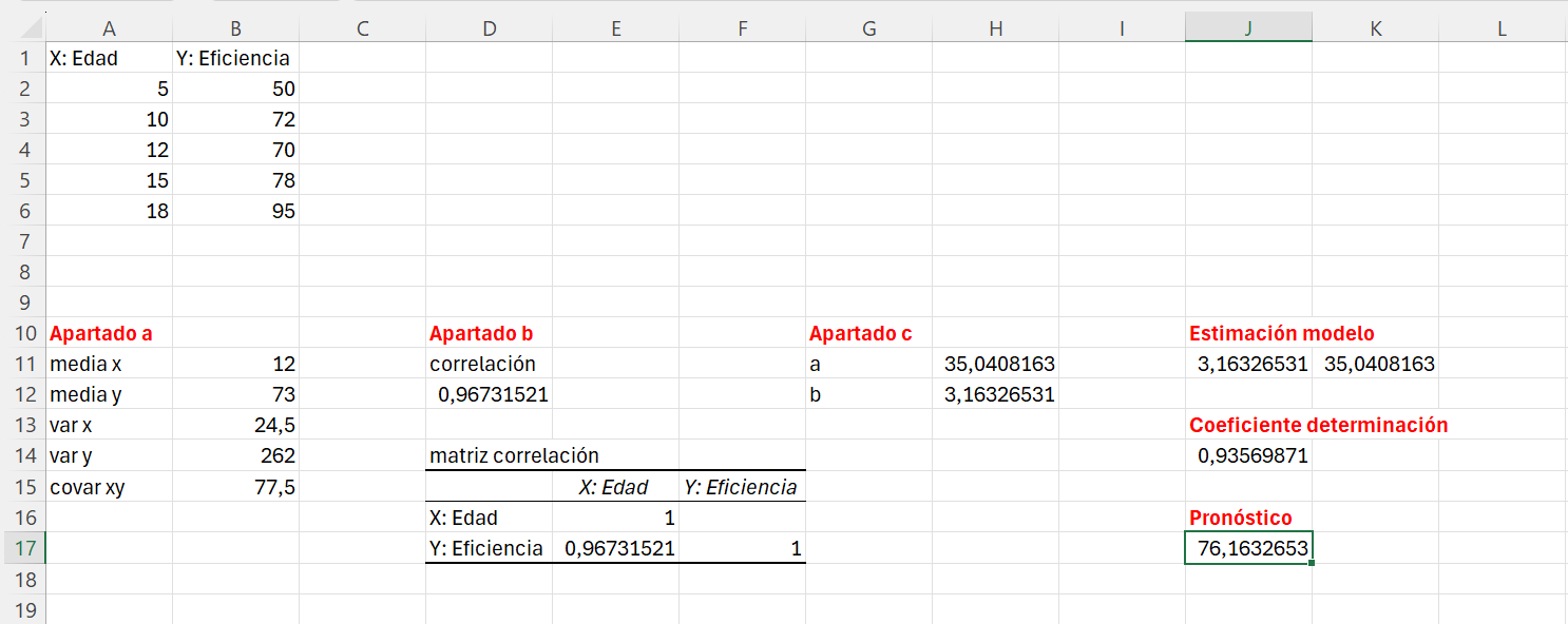Nos situamos en la celda J16 y escribimos Pronóstico. En la celda J17 intoducimos la fórmula: =pronostico.lineal(13,B2:B6;A2:A6). Para una empresa con 13 años de antigüedad estimamos una eficiencia productiva de 76.16 puntos porcentuales.