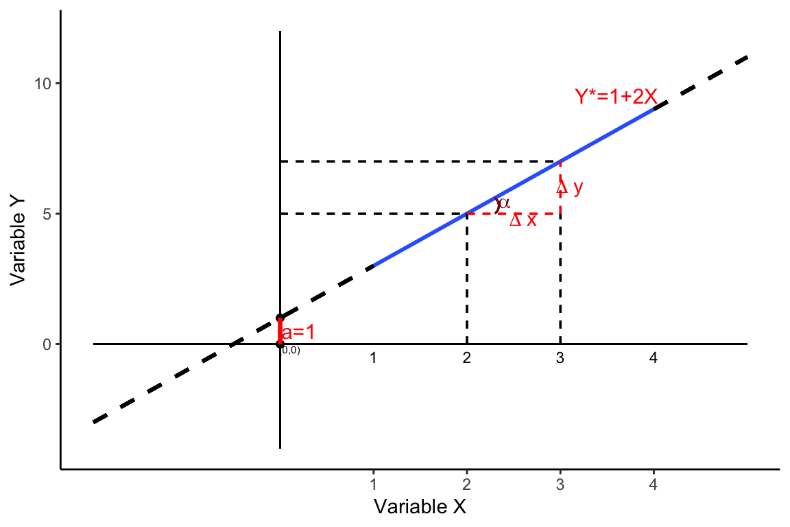 Como vemos en la Figura 3.5, la variable X toma valores entre 1 y 4 (rango de valores de X). La recta que mejor ajusta a la nube de puntos (en color azul) se estima para el conjunto de datos \((x_i,y_i)\) observado; es decir, la relación solo es válida dentro de ese rango de valores de X. En la Figura 3.5 se ha prolongado la recta de regresión (línea negra discontinua), tanto por debajo del valor 1 de X como por encima del valor 4. No obstante, suponer que la relación entre las variables es lineal fuera de este rango puede ser (muy) aventurado en muchas situaciones. El punto donde la recta prolongada corta el eje de ordenadas es el parámetro \(a\), la constante u ordenada en el origen de la regresión. El parámetro \(b\) es la pendiente de la recta de regresión: \[b=tg\alpha=\frac{\Delta y}{\Delta x} \tag{3.7}\] Por tanto, \(b\) mide la variación de Y ante un incremento unitario de X.