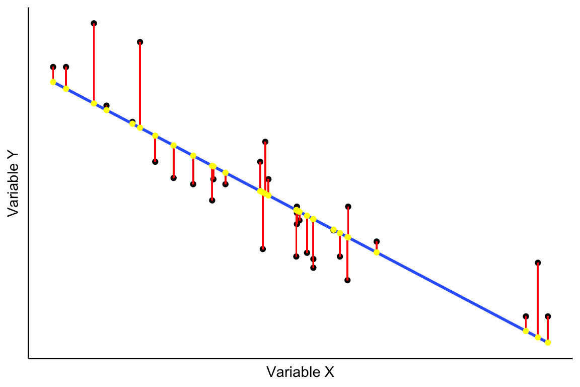 Consideremos una de esas rectas teóricas. En la Figura 3.3 se muestran los errores (en color rojo), que son las diferencias entre los valores observados (puntos negros en la figura) y los teóricos (puntos amarillos) obtenidos a partir del modelo estimado (recta de color azul).