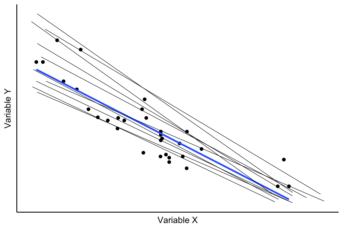 Cuando representamos un diagrama de dispersión situamos en el eje de abcisas la variable independiente (variable X) y en el eje de ordenadas la variable dependiente (variable Y). Por esa nube de puntos podemos hacer pasar infinitas rectas, como se representa en la Figura 3.2.