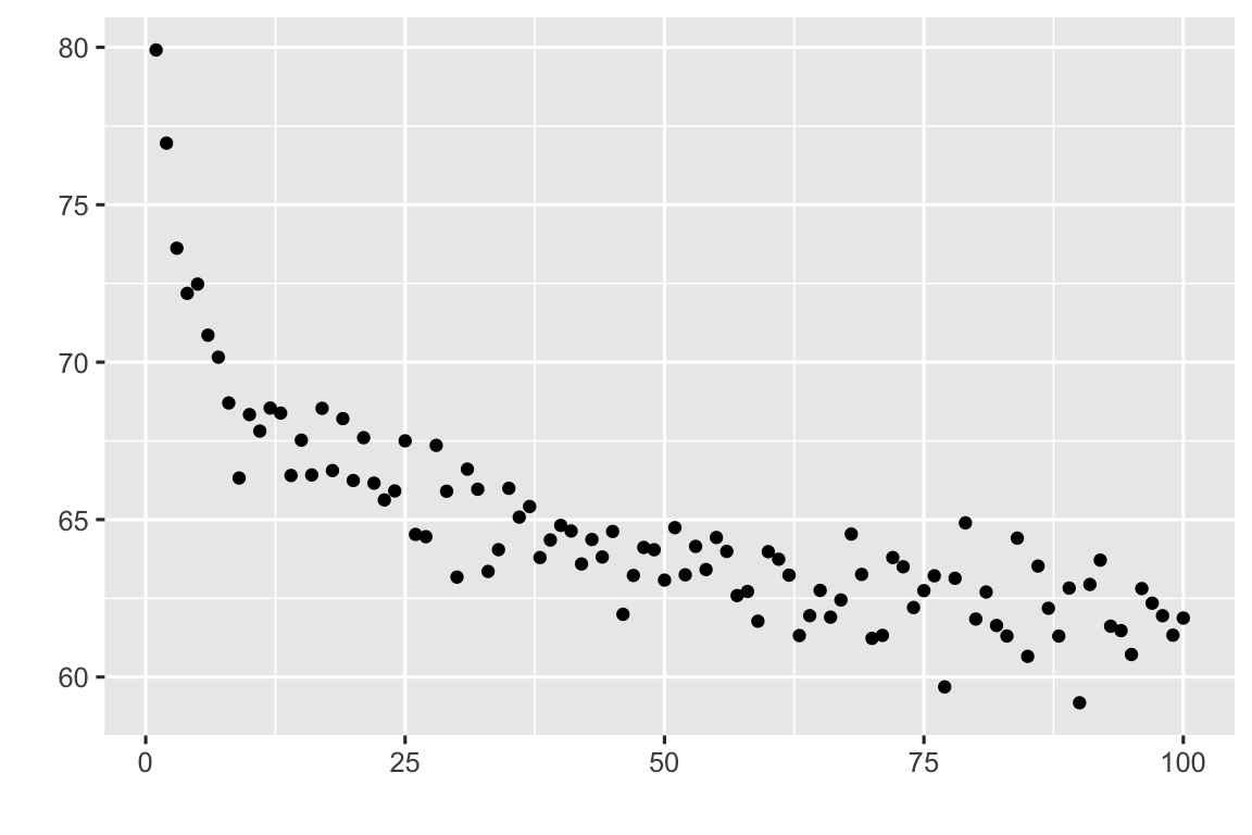 Apartado (c): Queremos obtener la estructura funcional: \(Eficiencia=f(Edad)\), suponiendo una relación lineal, es decir: \[Eficiencia^*= a + b \cdot Edad\hspace{2mm}\rightarrow\hspace{2mm} Y^*= a + b\cdot X\] A partir de la Ecuación 3.4, calculamos los valores de los parámetros: \(a\) y \(b\). Calculamos primero \(b\) porque su valor lo necesitamos para calcular \(a\). \[b = \frac{S_{XY}}{S^2_X}= \frac{77.5}{24.5}\approx 3.1633\] \[a = \overline{y} - b \cdot \overline{x} = 73 - 3.1633 \cdot 12 \approx 35.0404\] Por tanto, nuestro modelo estimado/teórico es: \[Y^*=35.0404 + 3.1633\cdot X\] es decir, \[Eficiencia^*=35.0404 + 3.1633\cdot Edad\] Para cada observación (\(x_i,y_i\)), los valores teóricos de la eficiencia (\(y^*_i\)) se obtendrán al sustituir el valor de \(x_i\) (edad de la empresa) en la expresión anterior, es decir: \[y^*_i=35.0404 + 3.1633\cdot x_i\]