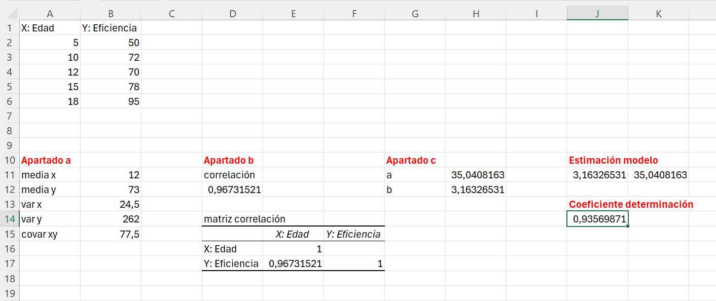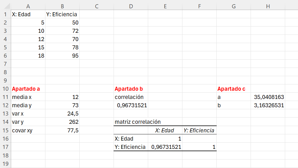 Ya estamos en disposición de calcular nuestras medidas. \[\overline{y}=\frac{\displaystyle\sum_{i=1}^{I=5}y_i}{n}=\frac{365}{5}=73\hspace{1mm}\text{(puntos porentuales)}\] \[S^2_Y=\frac{\displaystyle\sum_{i=1}^{I=5}(y_i-\overline y)^2}{n-1}=\frac{1,048}{5-1}=262\hspace{1mm}\text{(puntos porcentuales}^2)\] \[S_{XY}=\frac{\displaystyle\sum_{i=1}^{I=5}(x_i - \overline{x}) \cdot (y_i - \overline {y})}{n-1}=\frac{310}{5-1}=77.5\hspace{1mm}\text{(años} \cdot \text{puntos porcentuales)}\] y de resumir la información en el vector de medias y en la matriz de varianzas-covarianzas. \[m=\begin{pmatrix} \overline{x}\\ \overline{y} \end{pmatrix}=\begin{pmatrix} 12\\ 73 \end{pmatrix} \hspace{15mm} V=\begin{pmatrix} {S^2_X} & S_{XY} \\ & S^2_Y \end{pmatrix}=\begin{pmatrix} 24.5 & 77.5 \\ & 262 \end{pmatrix}\] Apartado (b): Basándonos en el resultado de la covarianza, podemos decir que hay una relación lineal positiva entre Edad y Eficiencia de las empresas. Por término medio, cuanto mayor es la edad de las empresas (variable \(X\)) mayor es también la eficiencia productiva (variable \(Y\)). Sin embargo, la covarianza únicamente nos informa del sentido de la asociación entre las variables porque, recordemos, no es una medida adimensional, depende de las unidades de medida de las variables. Por tanto, para analizar cómo es la intensidad de dicha relación lineal calculamos el coeficiente de correlación de Pearson, que sí es una medida adimensional. \[r_{XY}=\frac{S_{XY}}{S_X \cdot S_Y}=\frac{77.5}{\sqrt{24.5}\cdot \sqrt{262}}\approx 0.9673\] por lo que podemos concluir que la relación lineal positiva observada es muy fuerte, el coeficiente de correlación se acerca a 1.
