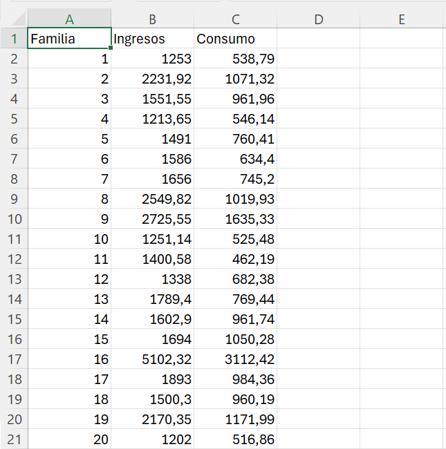 Ahora, vamos a realizar un ejemplo completo de regresión. Descargad el conjunto de datos que se encuentra en www.uv.es/ticstat/regresion.xlsx. Una vez descargado el fichero en vuestra directorio de trabajo, abridlo. Los datos se refieren a los ingresos (en euros) y consumo (en euros) de una muestra de 100 familias. Los datos han sido simulados con la única finalidad de practicar algunos de los conceptos explicados en este manual. En la Figura 3.9 se muestran las primeras 20 observaciones.