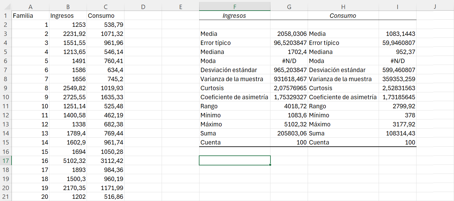 Observad que al seleccionar como rango de datos más de una variable, el resumen descriptivo se realiza para cada una de las variables seleccionadas, no tenemos que hacerlo una a una.