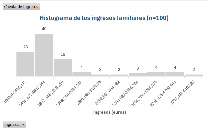 Con esta imagen sobre la forma de la distribución de ingresos vamos a construir un histograma. Como haríamos los propio con el consumo familiar (o con cualquier otra variable que tuviésemos en nuestro conjunto de datos), vamos a crear el histograma utilizando las tablas dinámicas. Pero antes de esto, necesitamos saber cúanto intervalos vamos a crear y cúal va a ser su amplitud. Respecto a la primera cuestión, vamos a construir 10 intervalos (\(k=\sqrt{n}=\sqrt{100}=10\)). En cuanto a la amplitud, será el resultado de dividir el rango de los ingresos entre el número de intervalos; por tanto, los intervalos tendrán amplitud: \(4,018.72/10=401.872\)