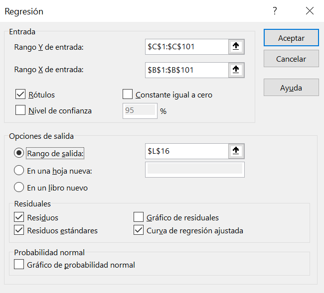 Seleccionamos: Datos > Análisis de datos > Regresión. Como se ilustra en la Figura 3.13, en el cuadro de Regresión indicamos el rango C1:C101 como el Rango Y de entrada porque el consumo es la variable dependiente. En *Rango X de entrada introducimos el rango B1:B101, que son los ingresos y es la variable independiente. Marcamos Rotulos en primera línea. Como rango de salida seleccionamos la celda L16, Excel devolverá los resultados de la regresión a partir de esta celda. Por último, en Residuales marcamos Residuos, Residuos estándares y Curva de regresión ajustada**.
