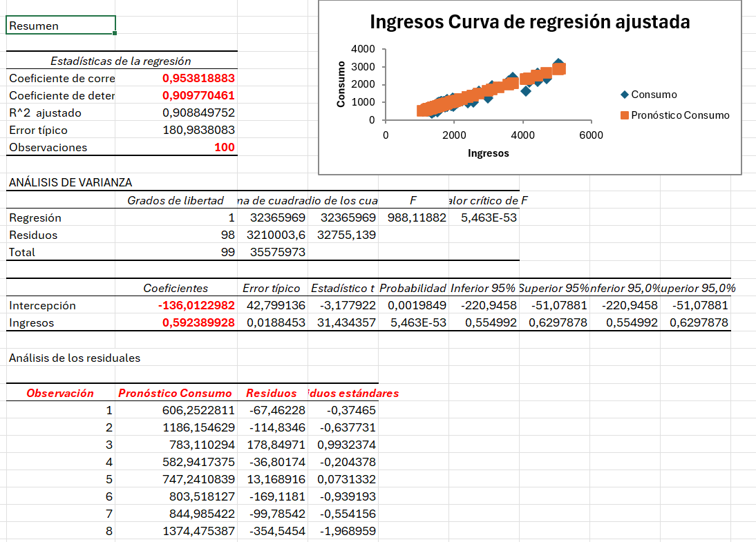 En el apartado Estadísticas de la regresión tenemos el coeficiente de correlación, el coeficiente de determinación y el número de observaciones. El $R^2, que como sabemos nos informa de la capacidad explicativa del modelo estimado, es aproximadamente 0.9098. Es decir, el 90.98% de la variablidad del consumo de las familias analizadas viene explicado por su dependencia lineal con los ingresos. El ajuste que hemos realizado es, por tanto, muy bueno, el modelo tiene una muy alta capacidad explicativa.