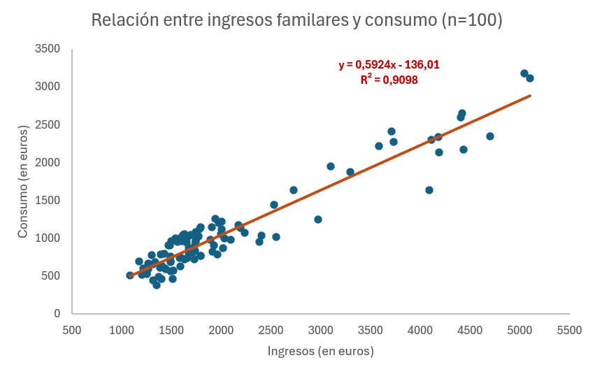 El coeficiente de regresión de los ingresos toma el valor 0.5924. En economía este coeficiente se refiere a la denominada propensión marginal a consumir. Si los ingresos de las familias se incrementa en 1 euro, se espera que el consumo se incremente (el coeficiente es positivo) en 0.59 euros aproximadamente. Como son valores bajos suele aumentarse la escala, es decir, si los ingresos de las familias se incrementan en 100 euros, se espera que el consume se incremente en 59.24 euros.